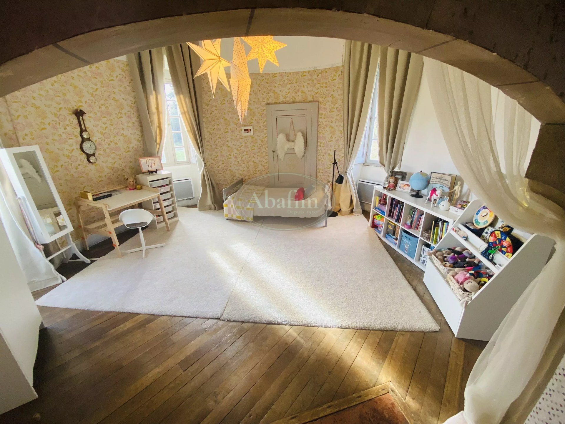 En enfilade, une autre pièce d'apparat de 90 m² également parquetée, les plafonds à la française.