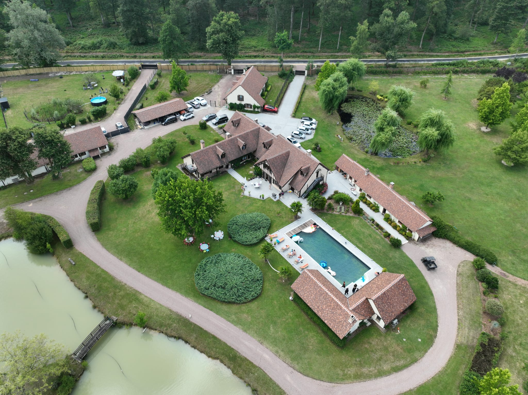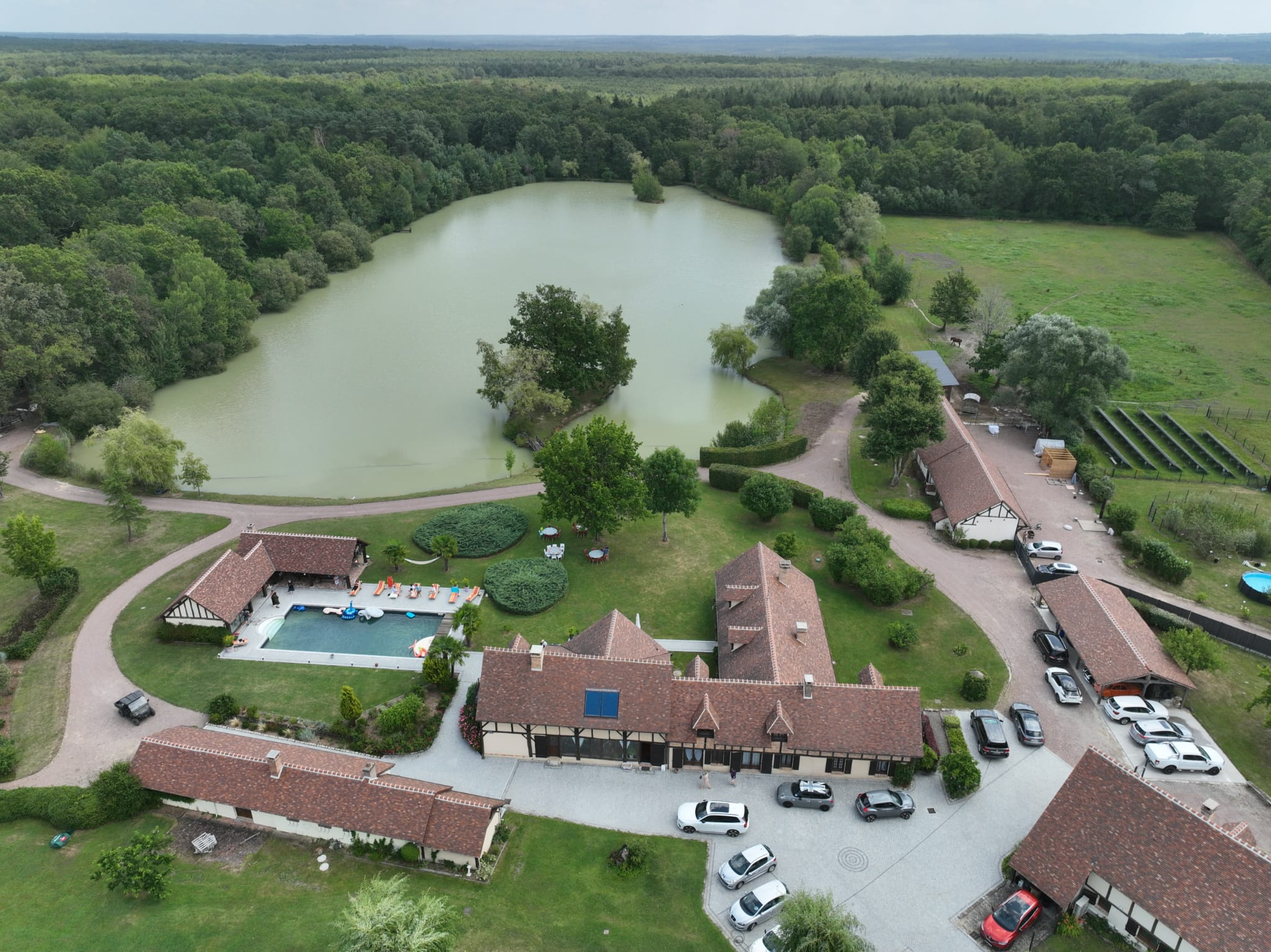 Côté extérieurs, tout est pensé pour en profiter : un parc clos de 7 hectares boisé avec un étang de plus 3.5ha , il est aussi agrémenté d'une piscine chauffée, un pool house avec jacuzzi et hammam, un terrain de tennis, un auvent avec cheminée pour les barbecues. De nombreuses dépendances sont également présentes : hangars agricoles, ateliers, garages, boxes à chevaux…
