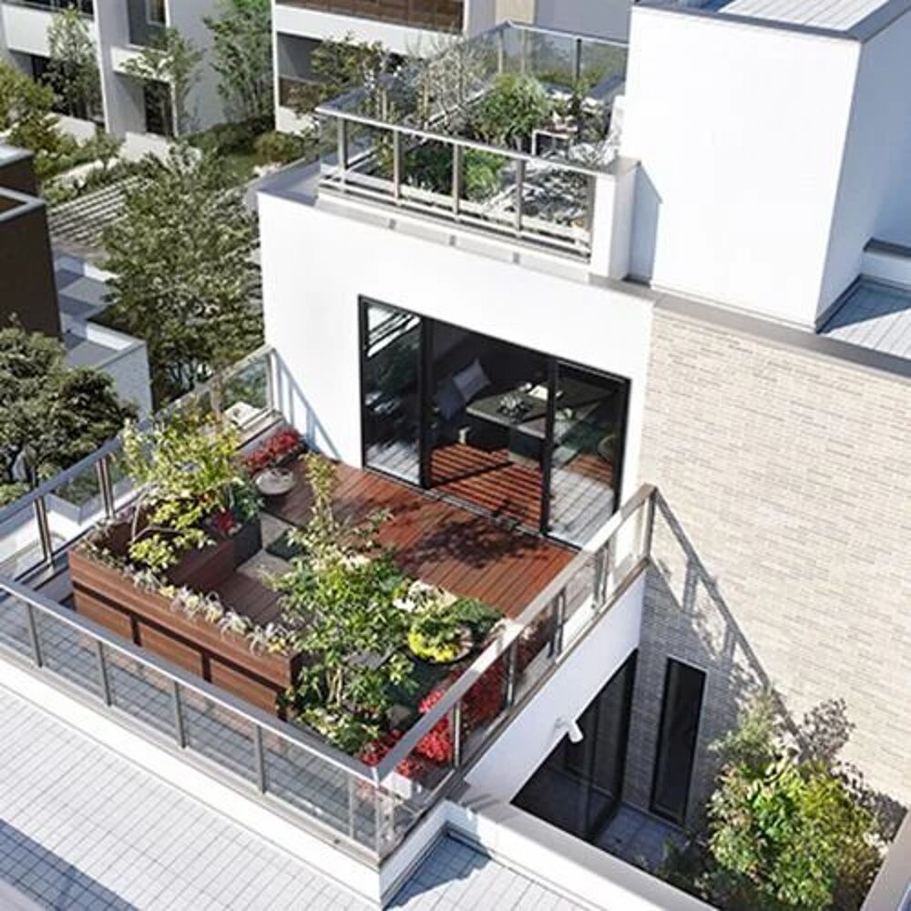Aux derniers étages, terrasses et jardins suspendus offrent des vues dégagées sur les toits de Paris, dans une atmosphère de calme absolu.