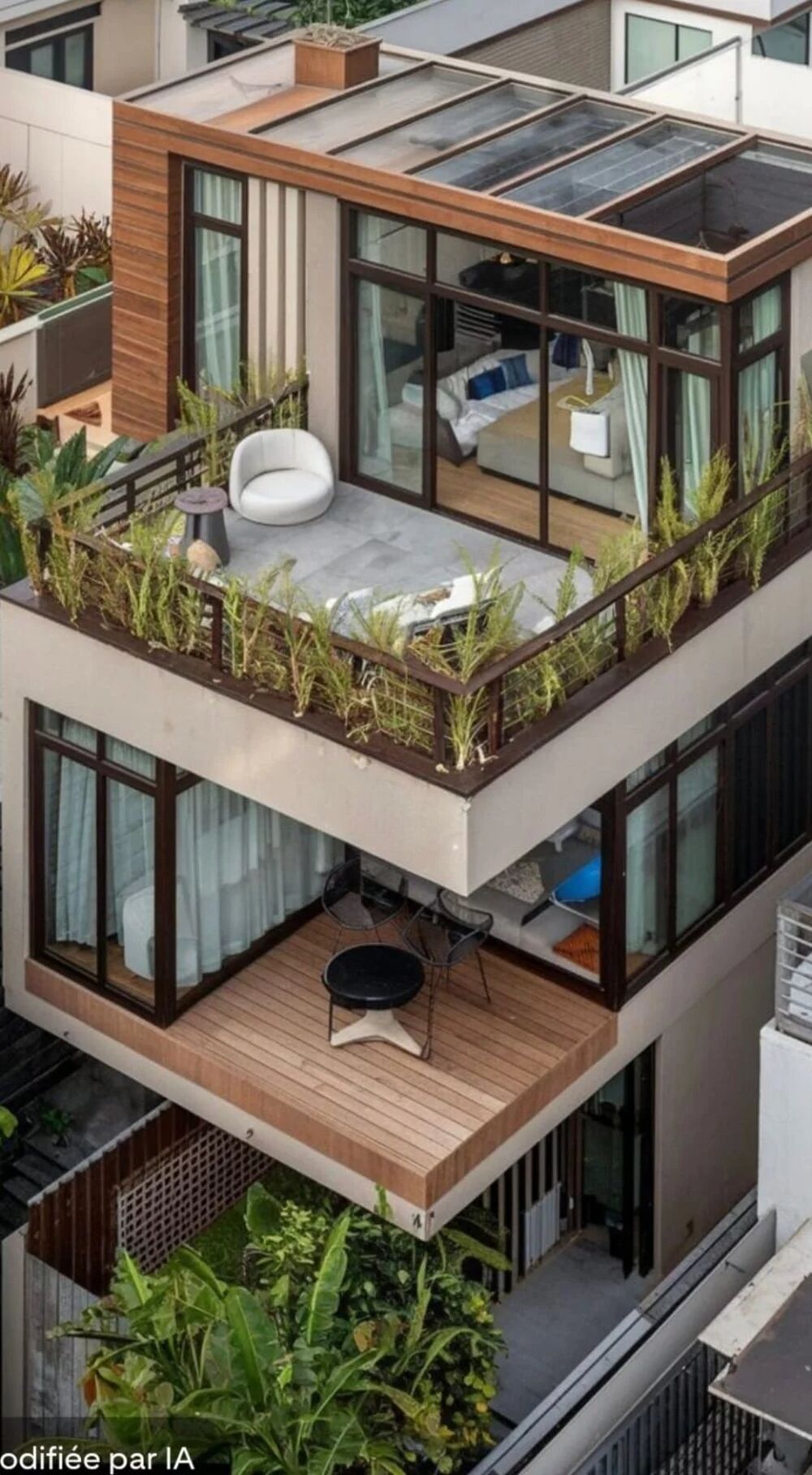Les niveaux supérieurs dévoilent des espaces de réception généreux, une cuisine ouverte sur un salon aux larges baies vitrées, plusieurs chambres, dont une suite parentale avec dressing et salle d'eau privative.