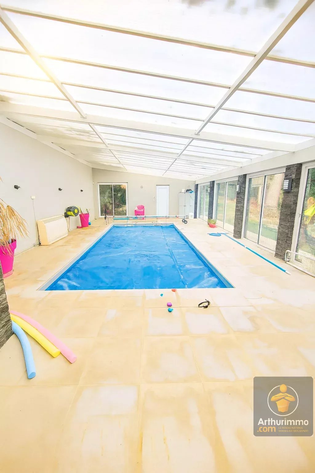 Piscine couverte et pool-house au fond du jardin.