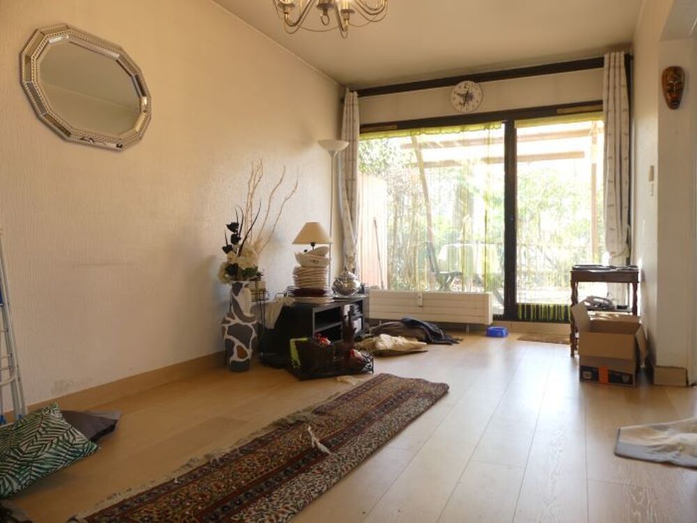 Au rez-de-chaussée : un lumineux séjour donnant directement sur une terrasse, ainsi qu'une cuisine fonctionnelle.