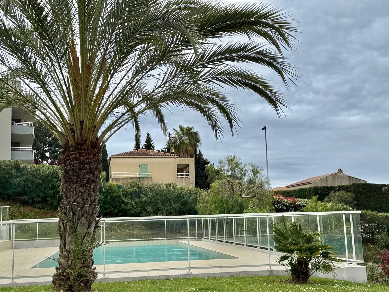Dans belle résidence récente sécurisée avec piscine, lumineux 2 pièces en parfait état, terrasse + jardin, ensoleillé, calme, parking couvert