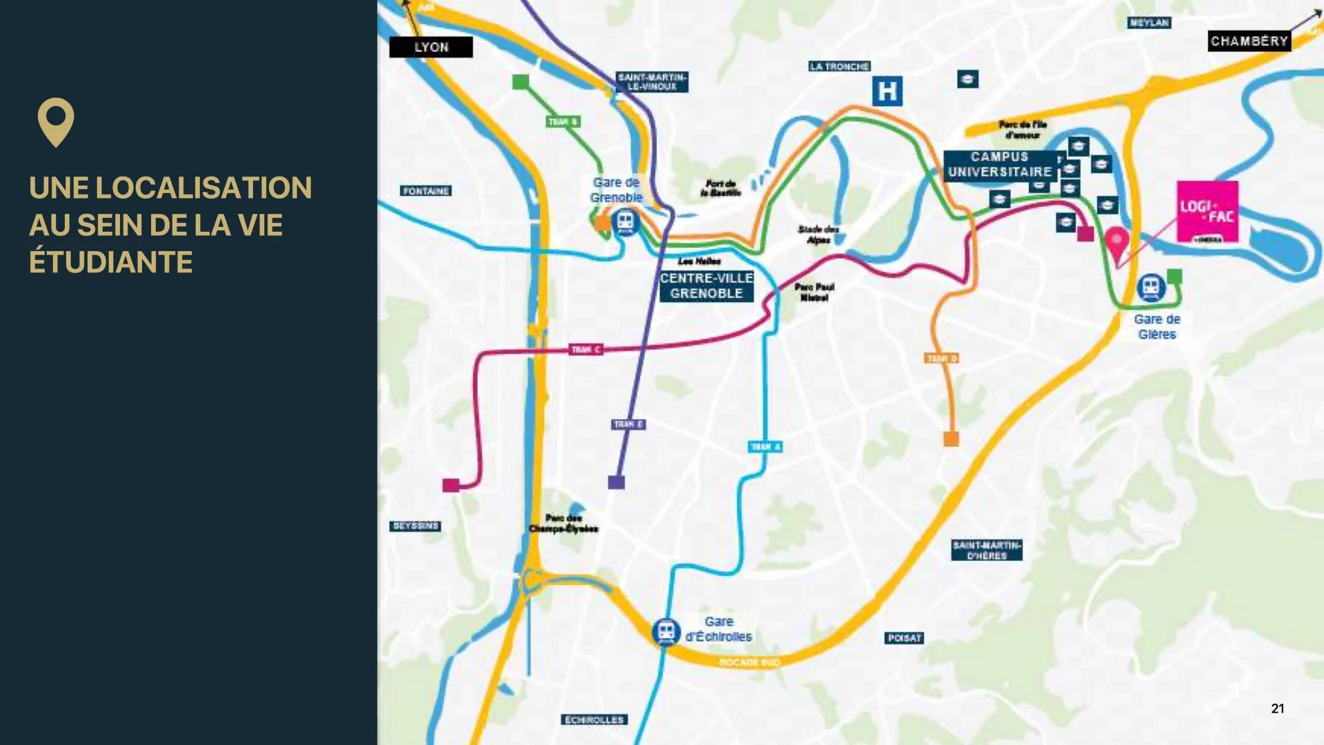 Idéalement située à Gières, sur le campus universitaire de Grenoble (l'un des plus grands de France), cette résidence propose 183 appartements modernes, fonctionnels et sécurisés, dans un environnement international, dynamique et connecté.