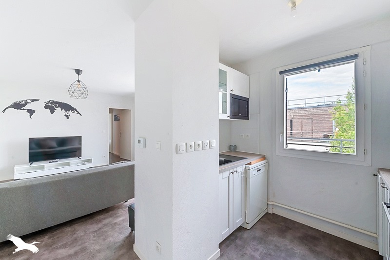 Il dispose d'une cuisine équipée, de deux chambres, d'une salle de bains et son espace de vie donne sur une terrasse de 30 m² à aménager selon vos envies.