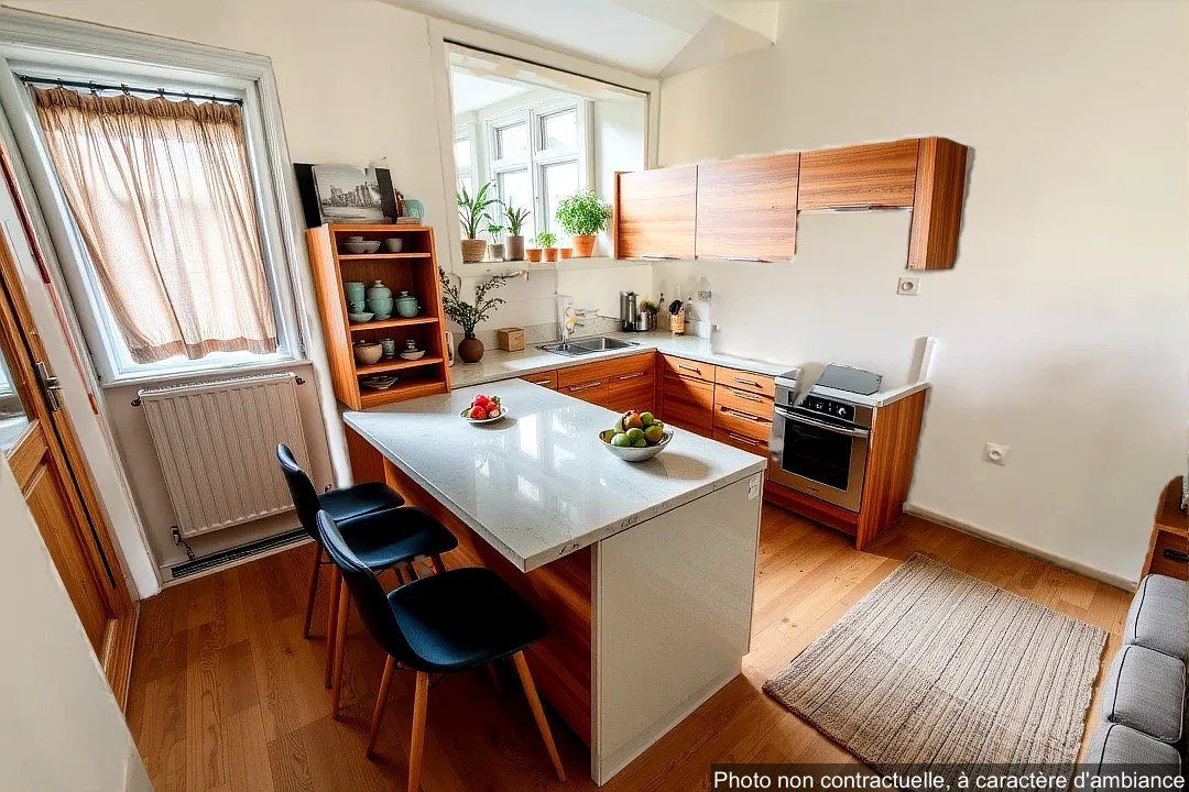 - Une pièce de vie lumineuse avec cheminée, ouverte sur un coin cuisine aménagée,