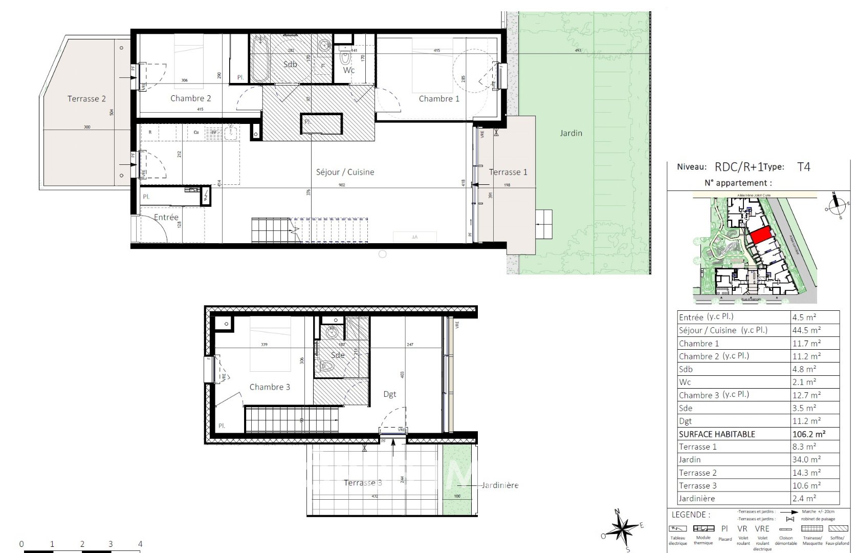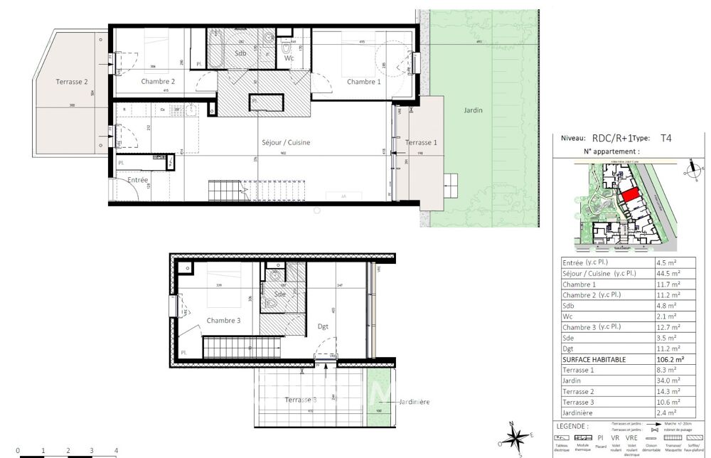 À l'extérieur, vous profiterez des terrasse ( 8m2, 10m²,14m² ) et d'un jardin privatif de 34m², parfaits pour vos moments de détente ou vos repas en plein air.