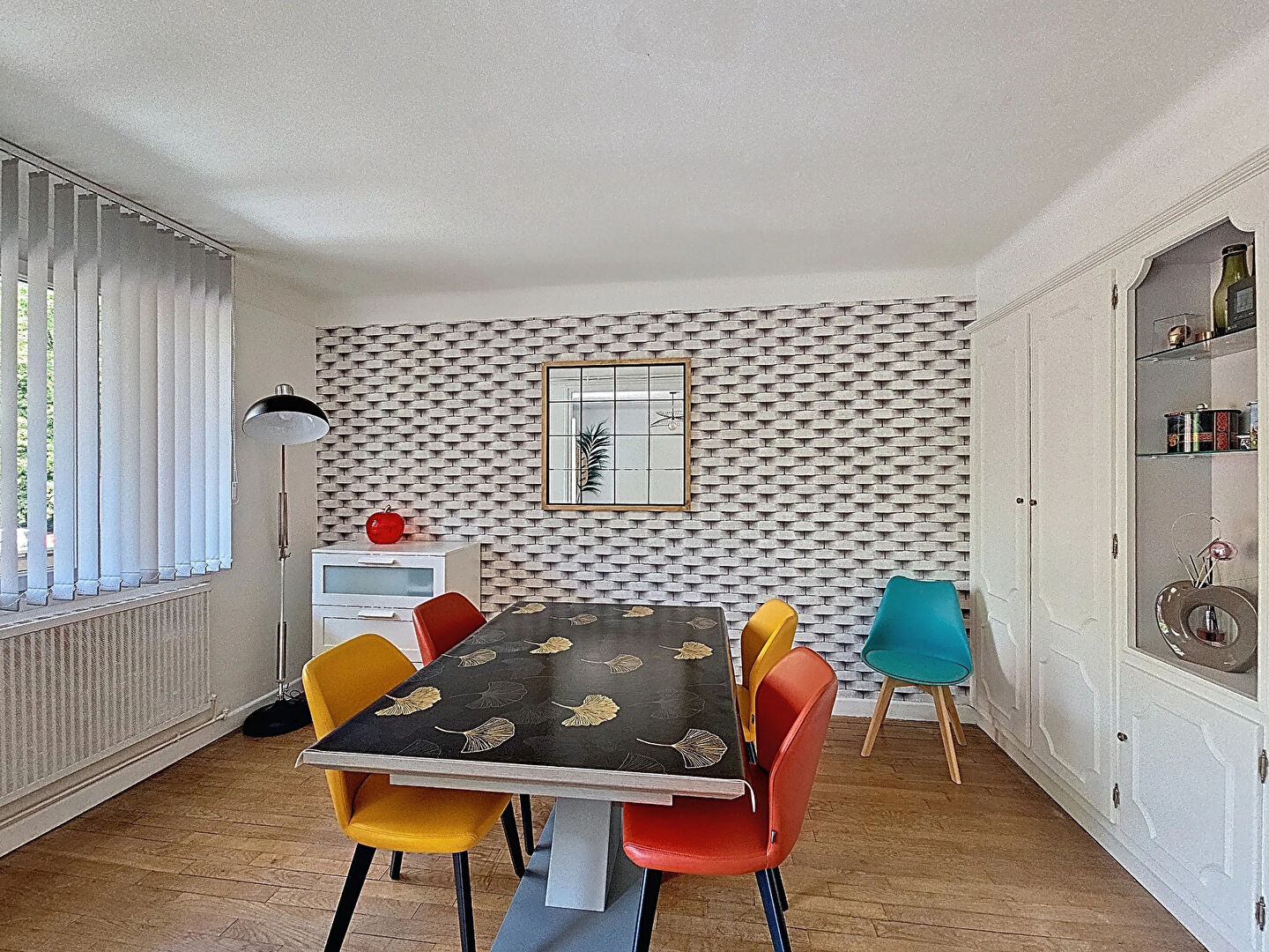 - Salon (17,71 m2) et salle à manger (10,87 m2) : sol parquet chêne, bibliothèque, placards de rangement, baie vitrée 4 pans sur balcon (7,77 m2) et fenêtre ;