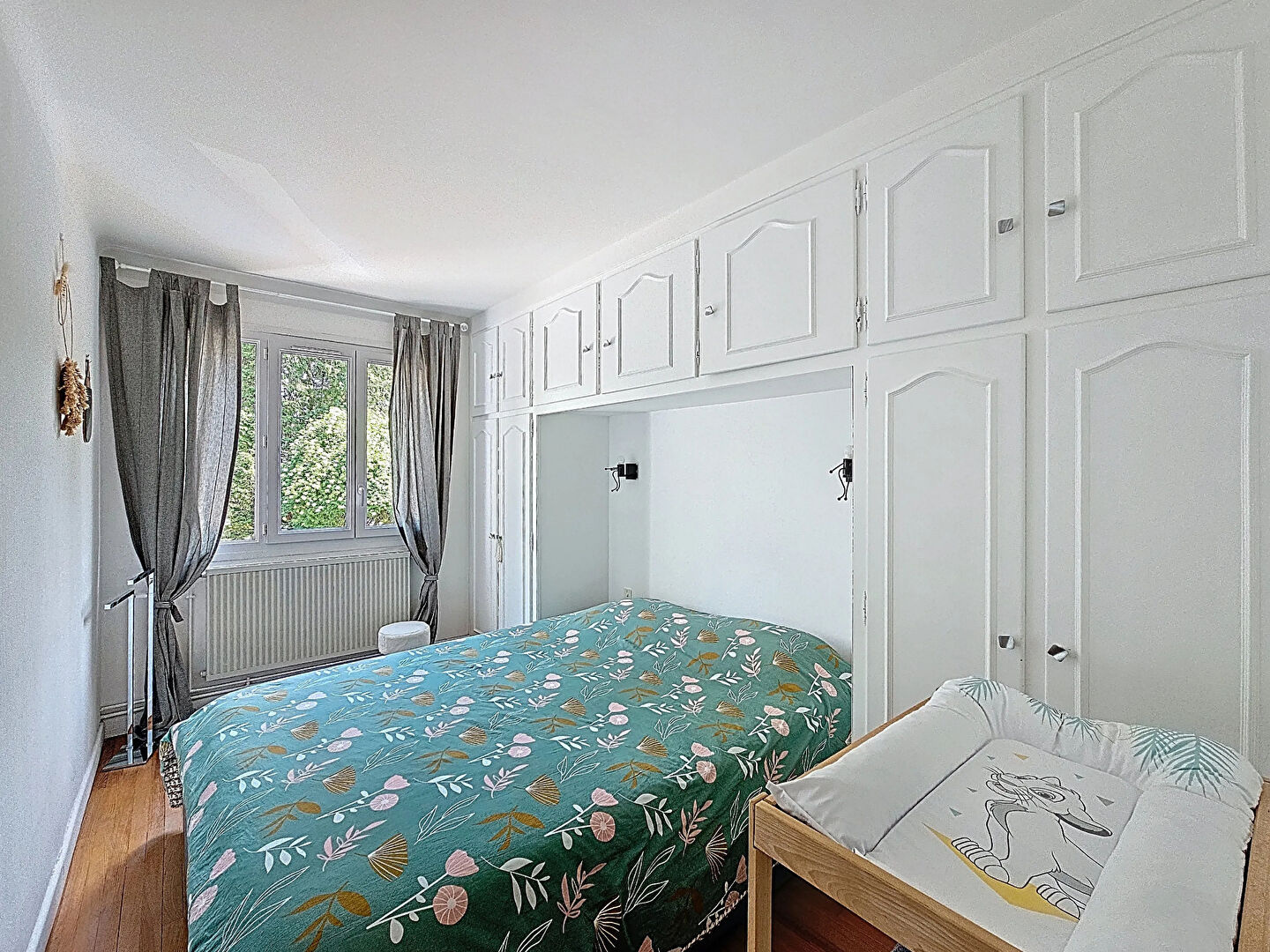 - Chambre 1 (10 m2): sol parquet sapin, placards de rangements, fenêtre 3 pans;
