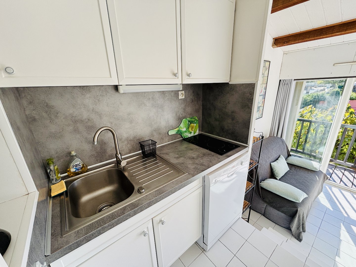 - Une cabine avec fenêtre et rangements, une salle d'eau rénovée équipée d'un lave-linge, des WC indépendants, une cuisine moderne et équipée, et une pièce à vivre avec belle hauteur sous plafond.