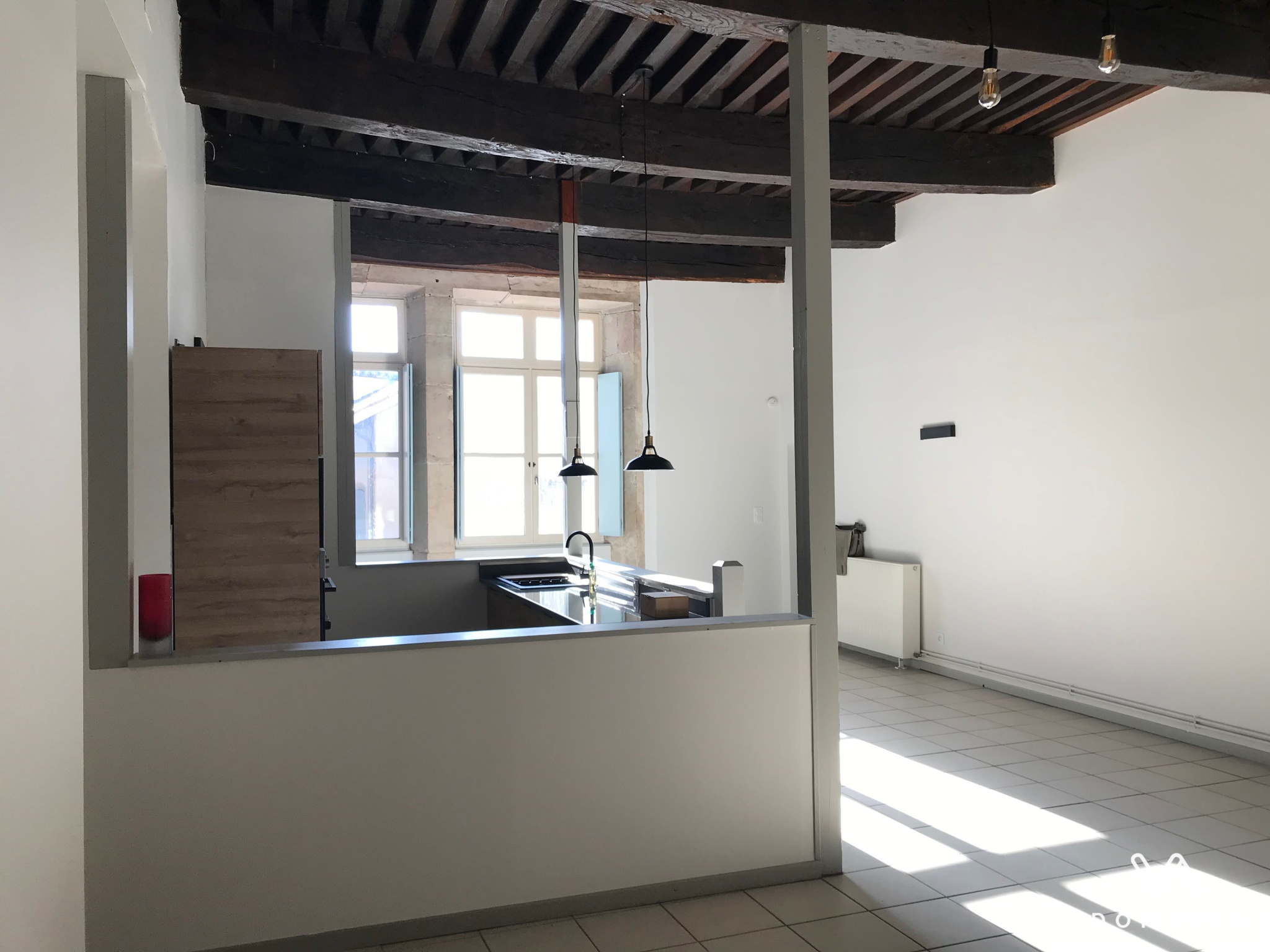 L'appartement offre un majestueux séjour lumineux avec sa grande cheminée, sa belle hauteur sous un plafond à la française et sa cuisine équipée.