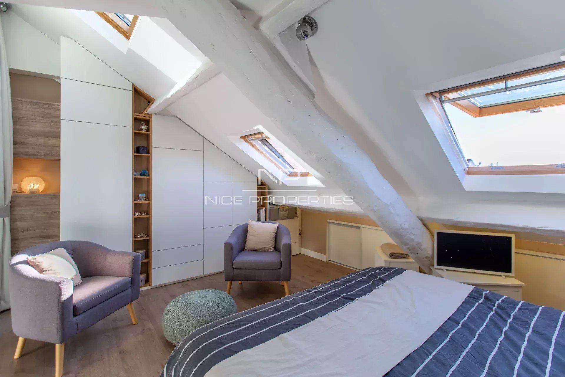 Domotique, climatisation réversible, double vitrage, volets électriques et de nombreux rangements sous pentes.