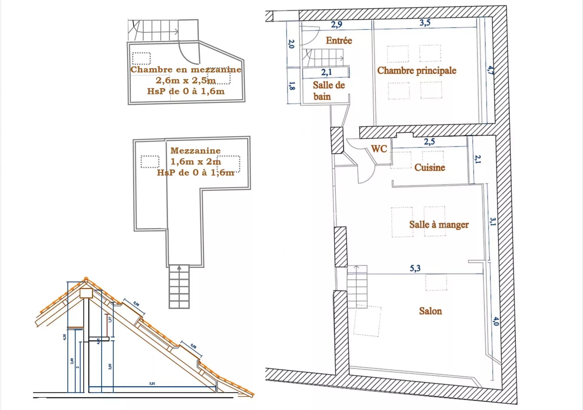 L'entrée dessert le séjour avec cuisine ouverte équipée intégrant un ilôt central, la chambre principale avec une penderie murale et 2 grands placards sous pentes, une salle d'eau avec bains, douche et toilettes, un espace buanderie et des toilettes séparés avec lave mains.