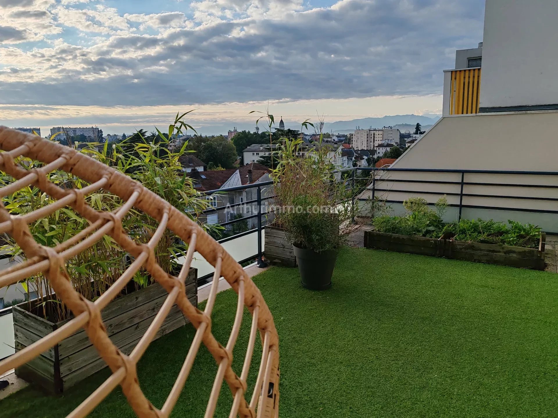 Au dernier étage d'un immeuble récent avec ascenseur, cet appartement traversant , en duplex se compose d'un séjour ouvrant sur une terrasse, d'une cuisine US équipée, de deux chambres ouvrant sur un balcon, d'une salle d'eau, et en duplex vous trouvez une grande mezzanine , une salle de bains avec WC et une superbe terrasse d'où l'on voit les Pyrénées.