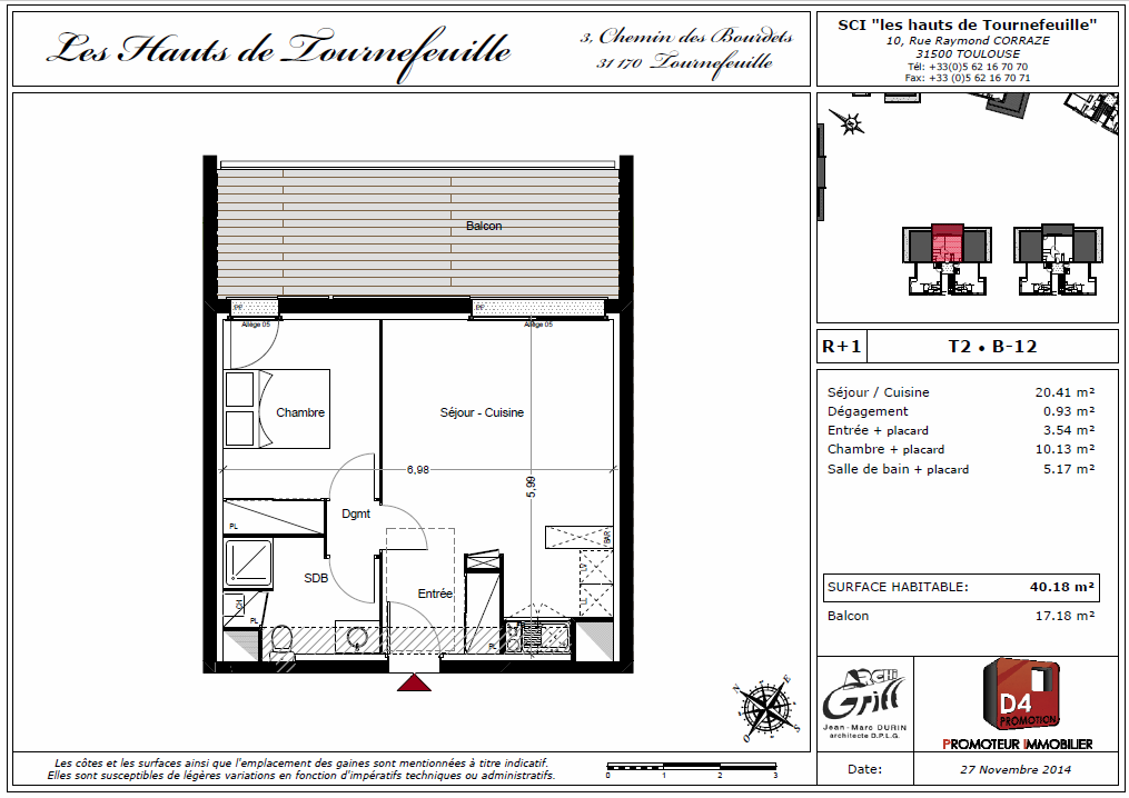 Tournefeuille, beau T2 de 39 m2 avec terrasse de 17 m2. Ce logement est en parfait état et se compose, d'une entrée, d'un séjour ouvrant sur cuisine et terrasse, d'une chambre avec rangement, et d'une salle de douche avec wc et placard, deux emplacements de parking viennent compléter cette offre. N'hésitez pas à me contacter pour plus de renseignements ou pour organiser une visite.