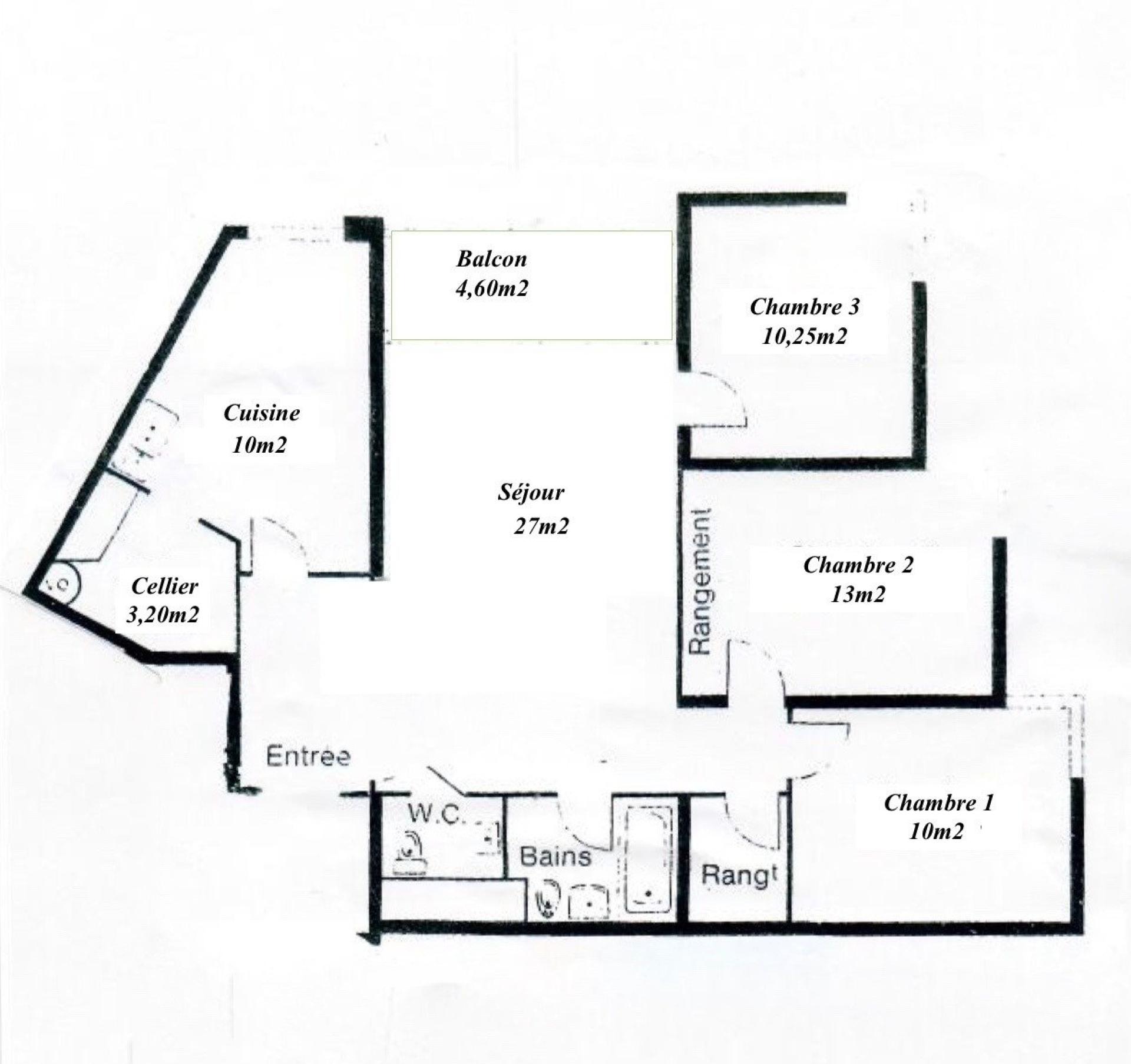 À l'intérieur, cet appartement de 82 m² comprend 4 pièces dont 3 chambres, une cuisine fermée, une salle de bain et un WC separé, offrant ainsi un espace de vie confortable et fonctionnel dans une résidence sécurisée avec gardien.