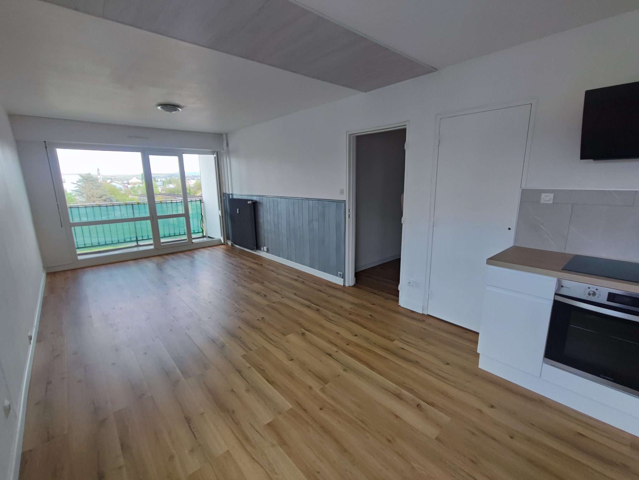 Entrée - 2 Chambres - Salle d'eau - WC - Cuisine équipée ouverte sur séjour accès balcon (Est).