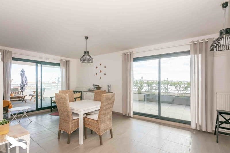 Île Sud, résidence de standing avec ascenseur, type 4 au 5è étage sur 7 de 77m², vues panoramiques sur le port, la mer et le mont Saint Clair, séjour/cuisine, 3 chambres, salle de bains et salle d'eau, wc séparé.