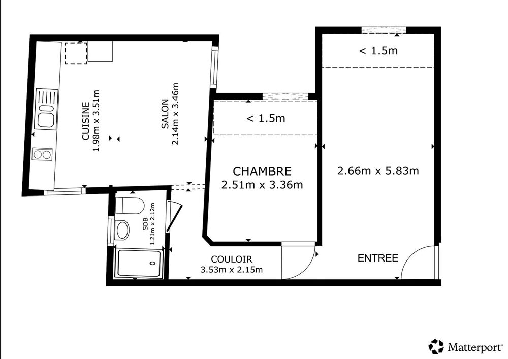D'une surface de 25.81m² carrez et 47.51m² au sol, Il se compose d'une entrée avec espaces de rangements, d'un séjour avec cuisine ouverte de 14.5m² sur cour calme et sans vis-à-vis, éclairé par 2 fenêtres ; d'une salle d'eau avec WC, et d'une chambre mansardée sous les combles,.