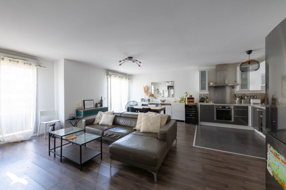 Grand et lumineux séjour ouvert sur cuisine avec balcon exposé ouest, deux chambres, une salle de bain et une salle d'eau.