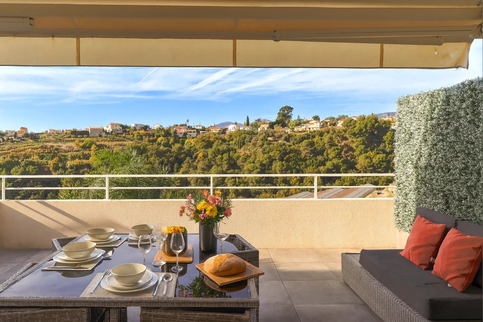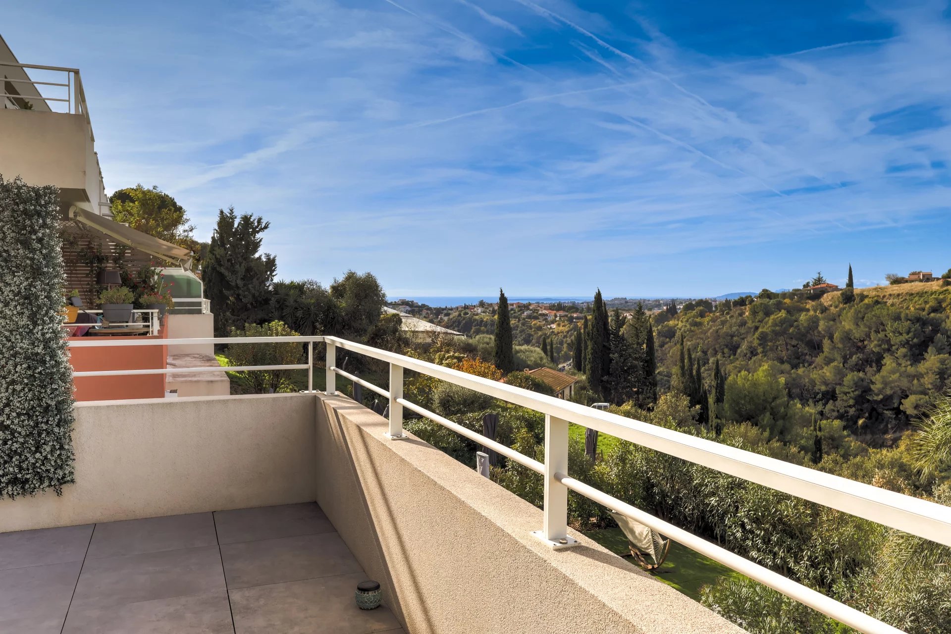 L'appartement séduit par sa belle luminosité et sa grande terrasse d'environ 30 m² exposée sud-ouest, offrant une vue dégagée sur les collines et la mer - un cadre paisible et verdoyant à quelques minutes seulement du centre-ville.