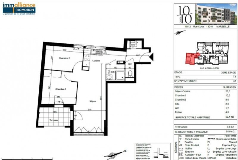 TYPE 3 VENDU LOUÉ CAPELETTE / RUE ALFRED CURTEL 13010 MARSEILLE. Dans immeuble récent, situé au 3 étage avec ascenseur, type 3 de 52,70m2, VENDU LOUÉ, traversant, tout confort et composé d'un hall d'entrée avec rangement, séjour/cuisine US aménagée et semi-équipée ( 26m2) donnant sur une TERRASSE de 6m2 (expo Est-Ouest), 2 chambres (8,6m2 et 10,50m2), salle d'eau et wc. Climatisation reversible. En supplément un BOX en sous-sol . Proche toutes commodités. DPE C. Montant estimé des dépenses annuelles d'énergie pour un usage standard: entre 570€ et 820€ par an. Les informations sur les risques auxquels ce bien est exposé sont disponibles sur le site Géorisques : https://www.georisques.gouv.fr. (Bail signé en 09/2024 / loyer 723€ / 87€ de charges / 31€ de TOM). CONTACT VISITE:Détails :