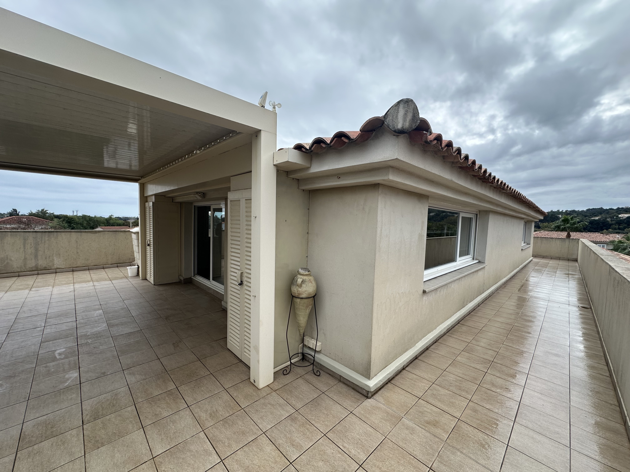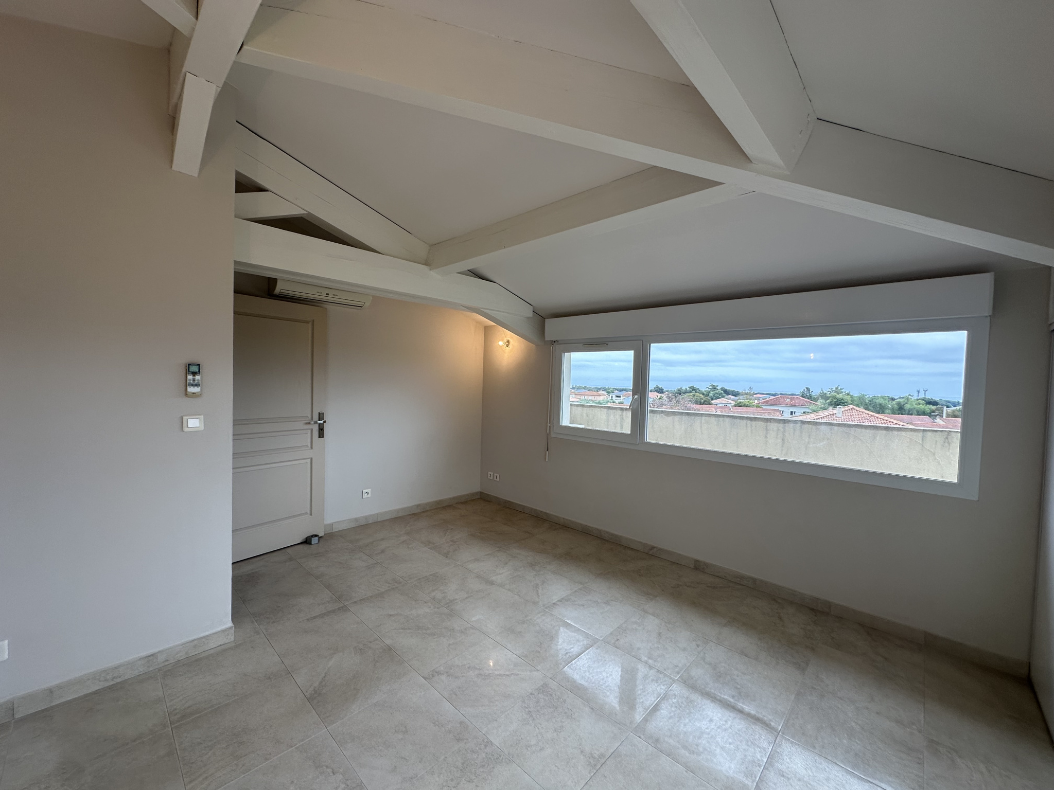 À l'étage, un vaste salon avec un toit cathédrale avec seconde cuisine qui s'ouvre sur une terrasse de près de 100 m2, offrant une vue dégagée sans vis-à-vis. Une troisième chambre et une salle d'eau avec WC complètent cet espace.