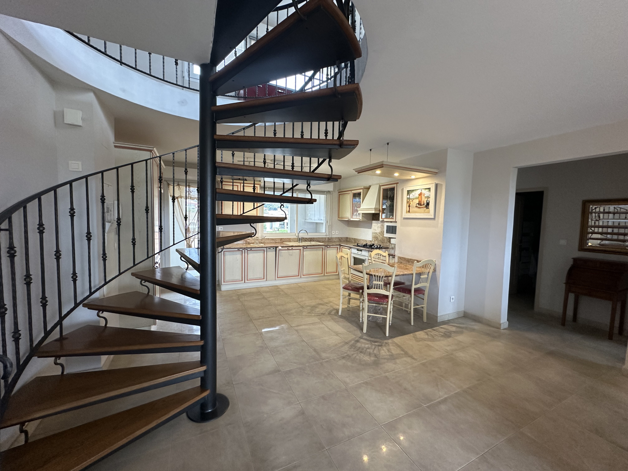L'appartement séduit par son esprit maison, ses belles hauteurs sous plafond, et son escalier central en colimaçon, véritable élément de caractère.