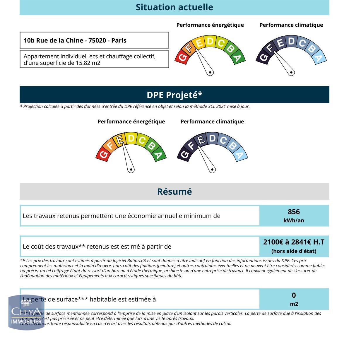STUDIO DE 15,82 M² PLUS 12 M² DE TERRASSE A VENDRE OCCUPE DANS LE 20EME ARRONDISSEMENT, RUE DE LA CHINE. - À vendre - Studio avec terrasse privative - 15,82 m² + 12 m² d'extérieur - Vendu occupé - Rue de la Chine, Paris 20e Rentabilité locative : 4,4 % Situé au cœur du très recherché quartier Gambetta, à deux pas des commerces et des transports, ce studio lumineux et parfaitement agencé représente une opportunité rare à Paris : un véritable espace extérieur privatif de 12 m², idéal pour profiter des beaux jours en toute tranquillité. Au 1er étage d'un immeuble sécurisé et bien entretenu des années 70, le bien développe 15,82 m² habitables, prolongés par une terrasse spacieuse, offrant un confort de vie et une valeur ajoutée particulièrement appréciée sur le marché parisien. Un investissement clé en main Vendu occupé, ce studio génère un loyer mensuel de 600 € hors charges, complété par 50 € de provisions pour charges. Le bail en cours (3 ans) assure une rentabilité immédiate et sécurisée, idéale pour un investisseur souhaitant un placement stable et sans vacance locative. Un emplacement recherché et dynamique Entre Gambetta, Pelleport et le Père-Lachaise, le quartier séduit par son ambiance vivante, ses espaces verts, ses commerces de proximité et son excellente desserte en transports (métros Gambetta - lignes 3 et 3bis, Pelleport - ligne 3bis). Les points forts : Studio vendu occupé avec revenus locatifs immédiats Terrasse privative de 12 m², un véritable atout rare à Paris Quartier prisé, dynamique et bien desservi Immeuble calme, sécurisé et bien entretenu Un bien idéal pour un investissement locatif rentable aujourd'hui ou un futur pied-à-terre parisien avec extérieur, dans l'un des secteurs les plus attractifs de l'Est parisien. Honoraires à la charge du vendeur. Vous pouvez consulter les barèmes d'honoraires à l'adresse suivante : . Logement à consommation énergétique excessive. Montant estimé des dépenses annuelles d'énergie pour un usage standard : entre 500 et 720 euros. Prix moyens des énergies indexés en 2025. Les informations sur les risques auxquels ce bien est exposé sont disponibles sur le site Géorisques : https://www.georisques.gouv.fr* Prix net, hors frais notarié, d'enregistrement et de publicité foncière.