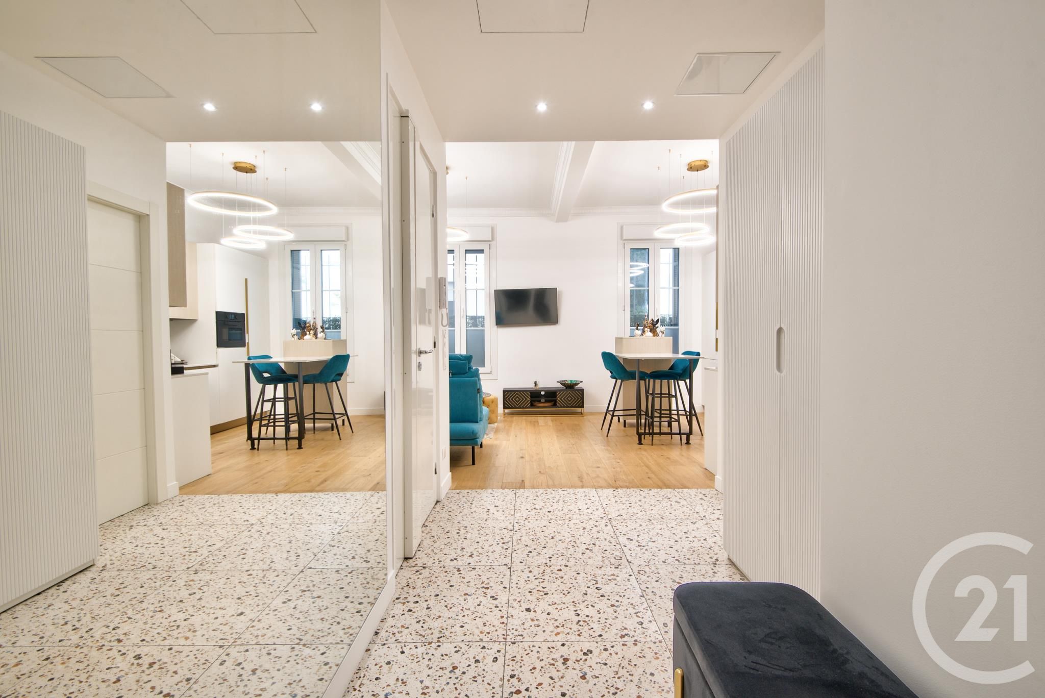 Exceptionnel appartement de 2 chambres et 2 salles de bains, entièrement rénové, situé au rez-de-chaussée de la célèbre Promenade des Anglais, à deux pas de la mer. Le séjour spacieux avec cuisine ouverte offre un cadre de vie moderne et confortable.