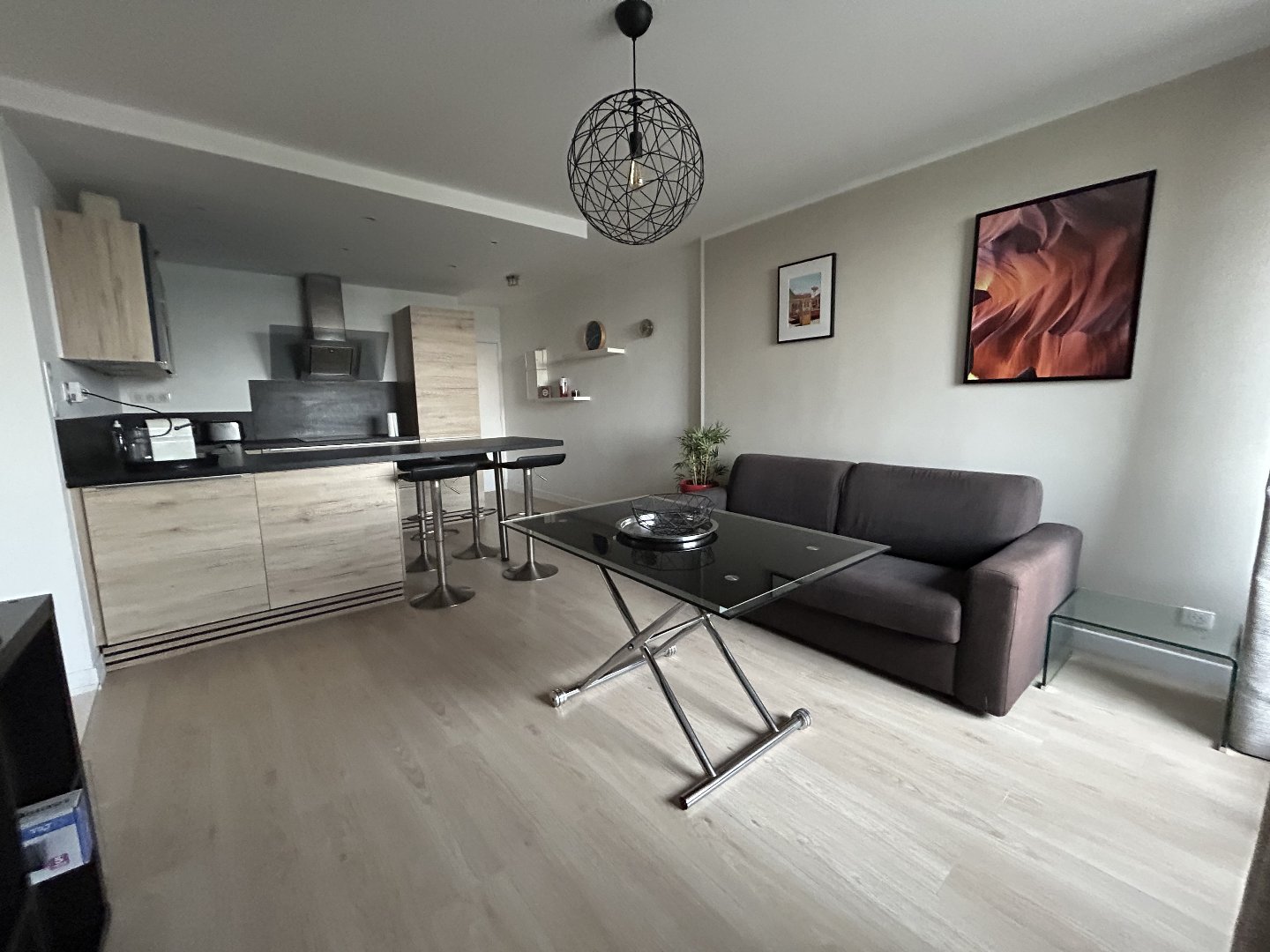 Séjour cuisine ouverte équipée de près de 25 m² ouvrant sur une loggia, belle chambre, salle d'eau actuelle...