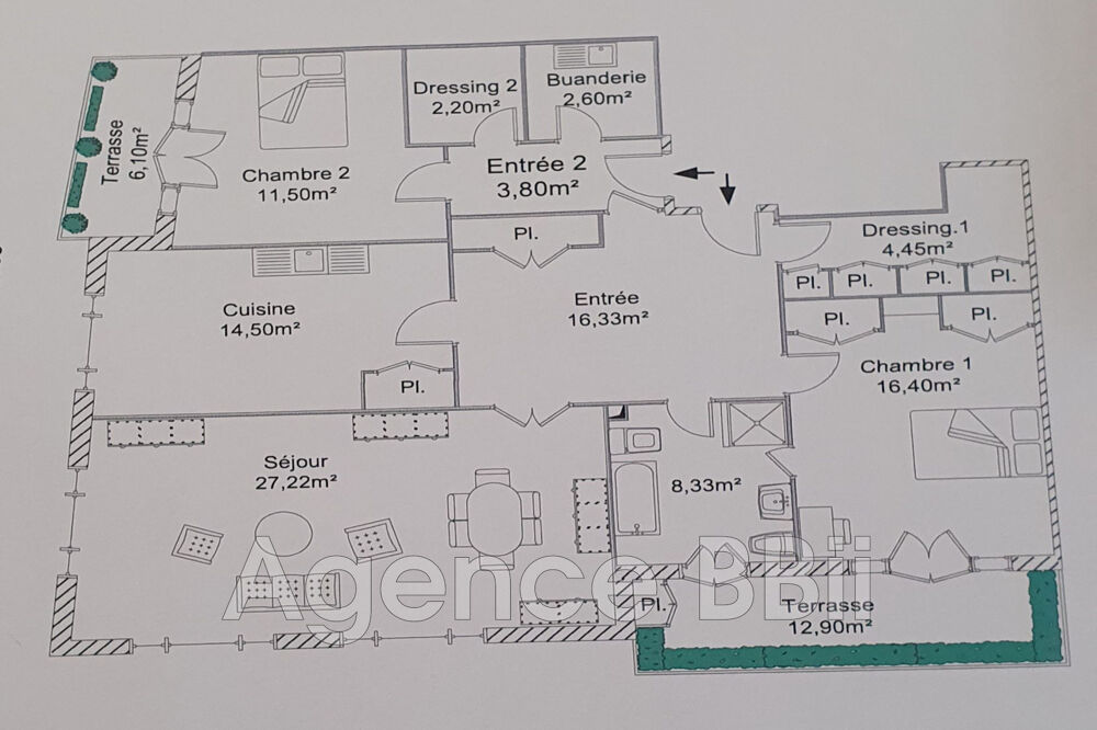 Un Appartement 3p (qui peut être transformé en 4p) qui se compose d'une entrée un séjour, une cuisine indépendante, 2 chambres, une salle de bains, dressing, 2 terrasses, une de 12 m² et une autre de 6 m², buanderie, cave (voir plan)