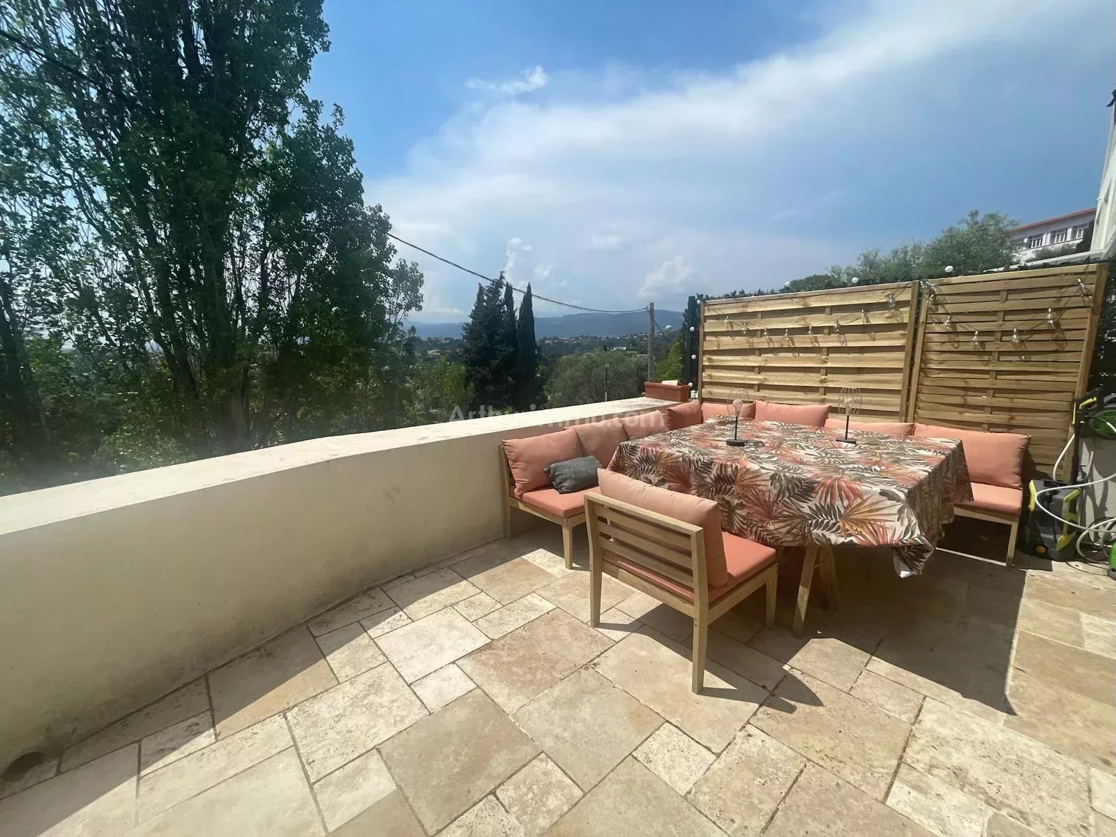 En excellent état et offrant une vue panoramique sur les collines et mer, il bénéficie d'une exposition Sud Ouest, au calme absolu et sans vis-à-vis, ainsi que de terrasses totalisant 77 m².
