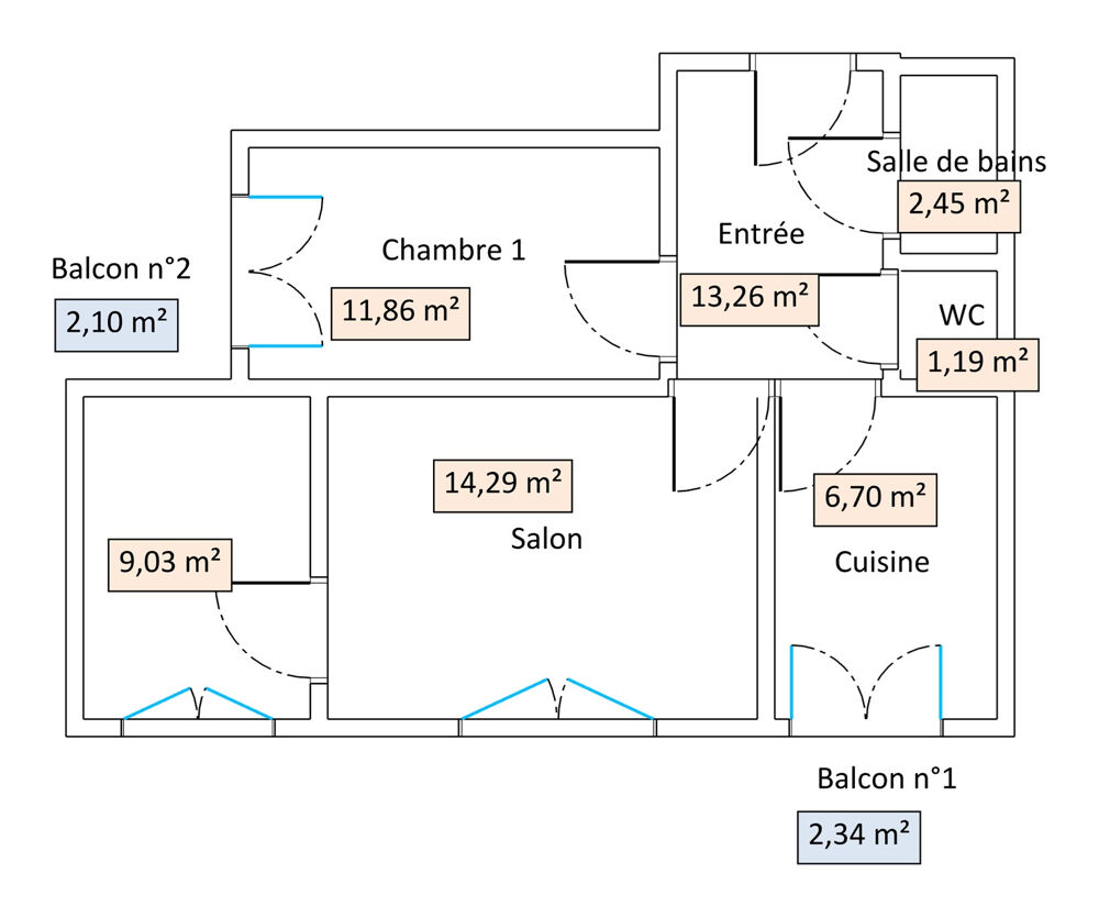 Il se compose d'une entrée qui distribue un séjour de 14 m2, une cuisine séparée avec loggia bénéficiant d'une vue dégagée et sans vis à vis, 2 chambres, une salle de bains et sanitaires.