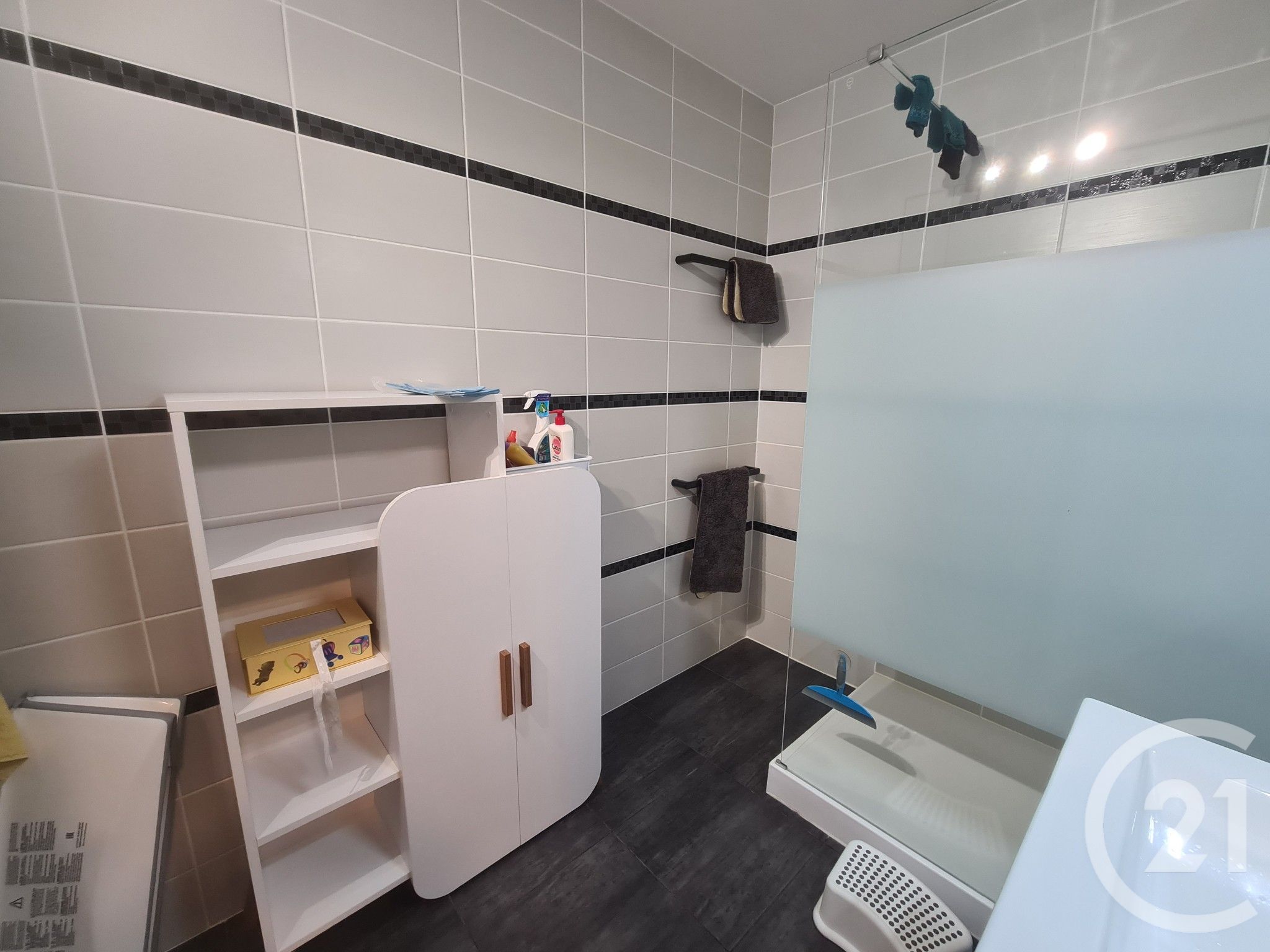 Salle d'eau moderne, entièrement refaite avec murs faïencés