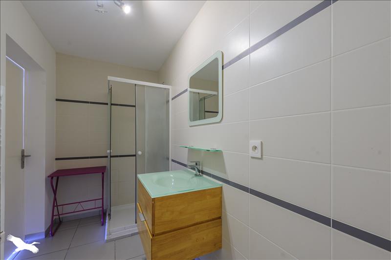 Appartement de plain pied offrant une pièce de vie lumineuse avec coin cuisine, une salle d'eau et un WC.