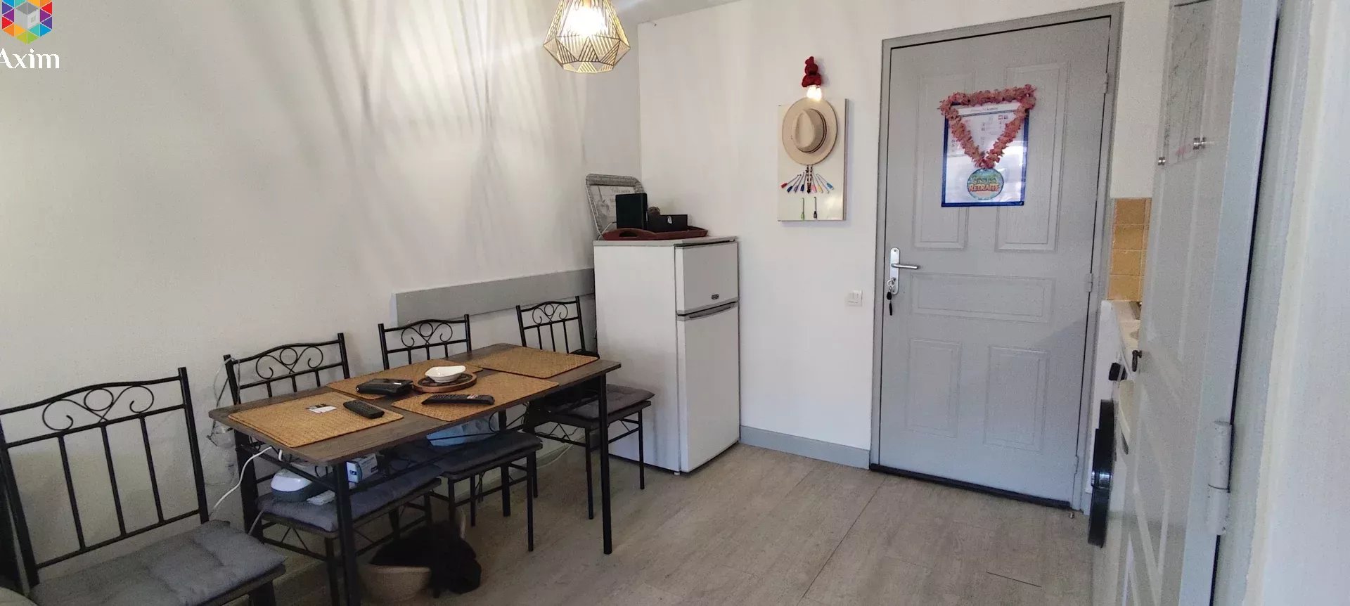 La pièce à vivre combine une kitchenette bien équipée avec un espace séjour, offrant confort et praticité.