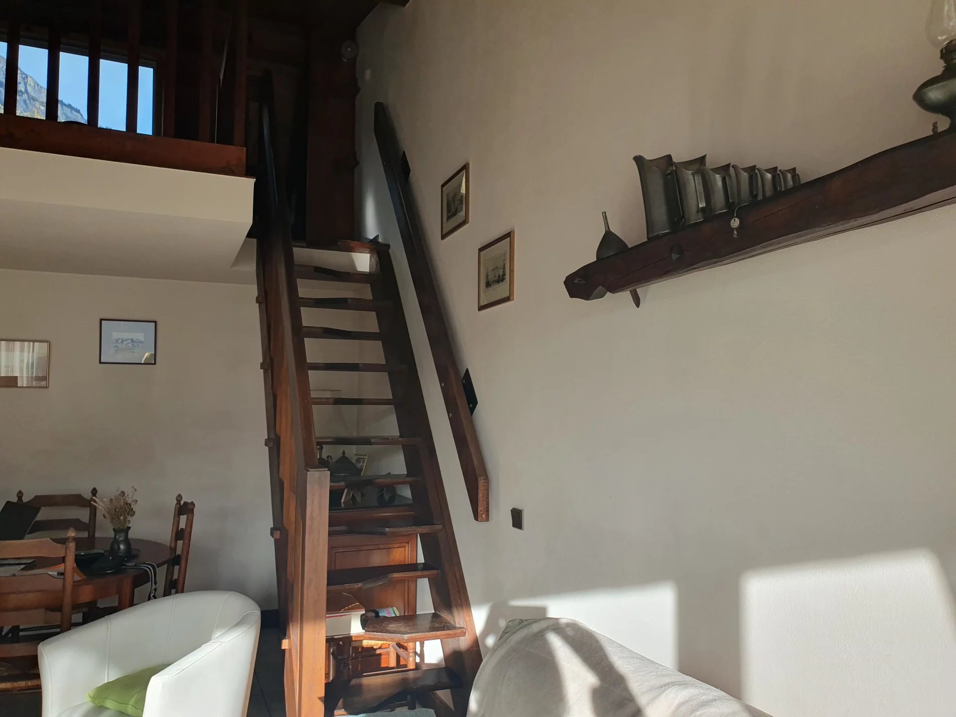 Un escalier dessert une mezzanine, un bureau et un grenier dressing.