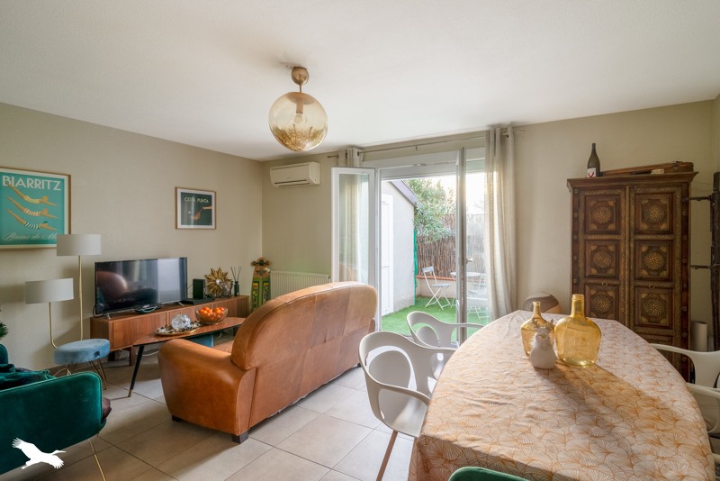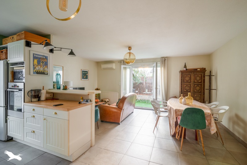 Séjour lumineux avec cuisine ouverte, climatisation à chaque niveau, et terrasse sans vis-à-vis.