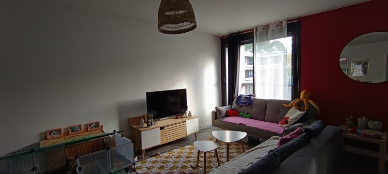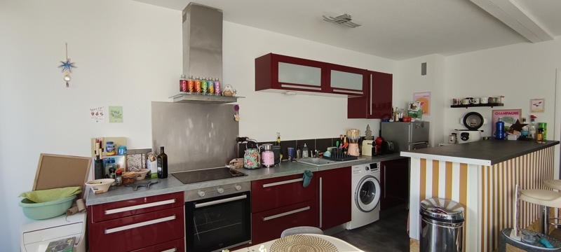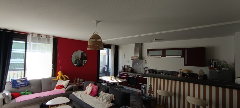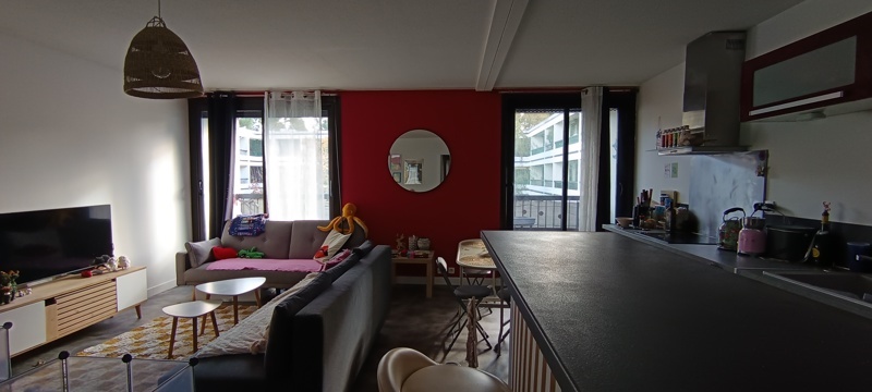 L'appartement offre une pièce de vie lumineuse et spacieuse avec cuisine aménagée, ouvrant sur l'extérieur.