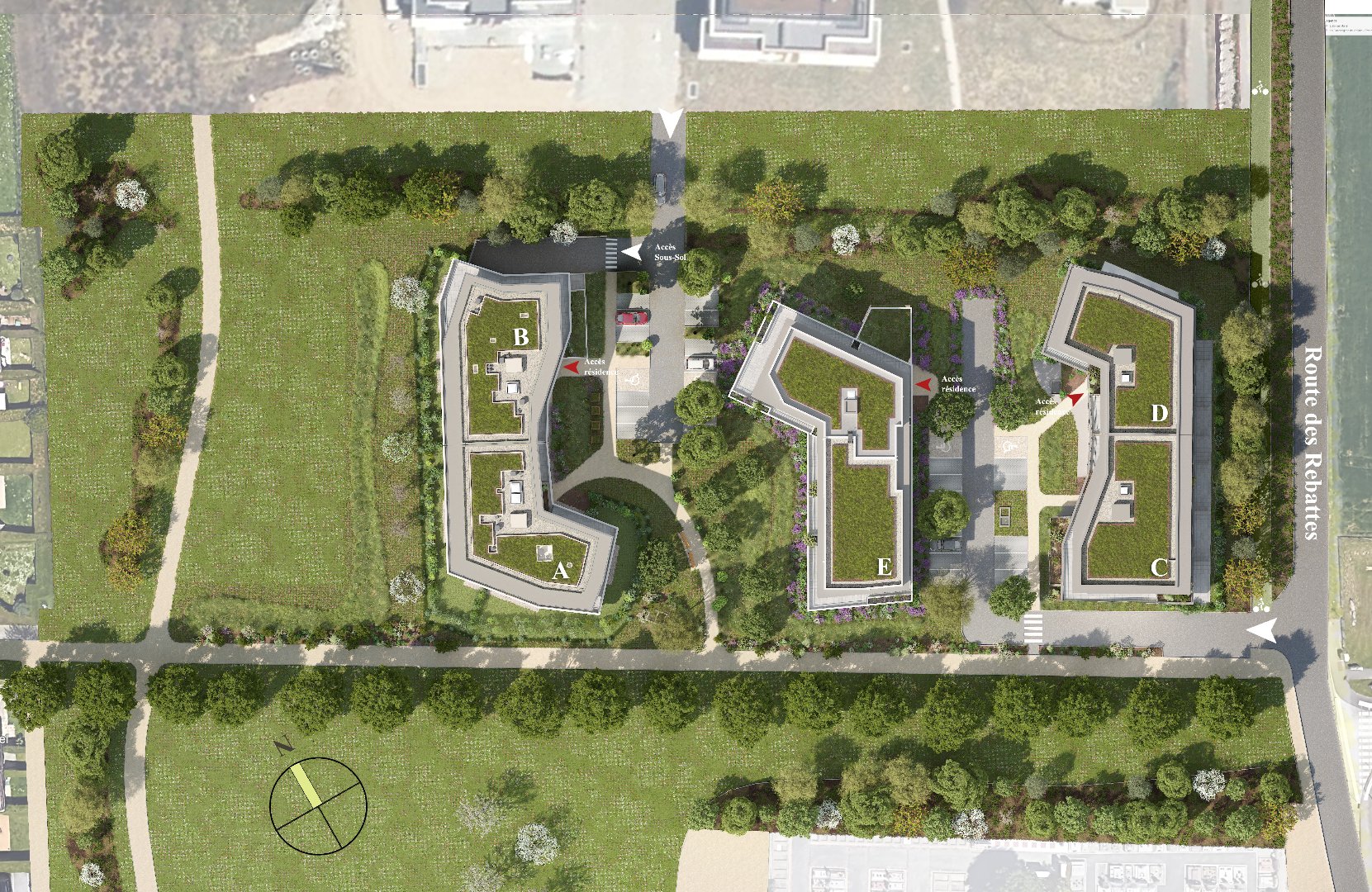 Ses 3 bâtiments aux lignes douces, aux teintes naturelles et toitures végétalisées, offrent un environnement verdoyant et apaisant.