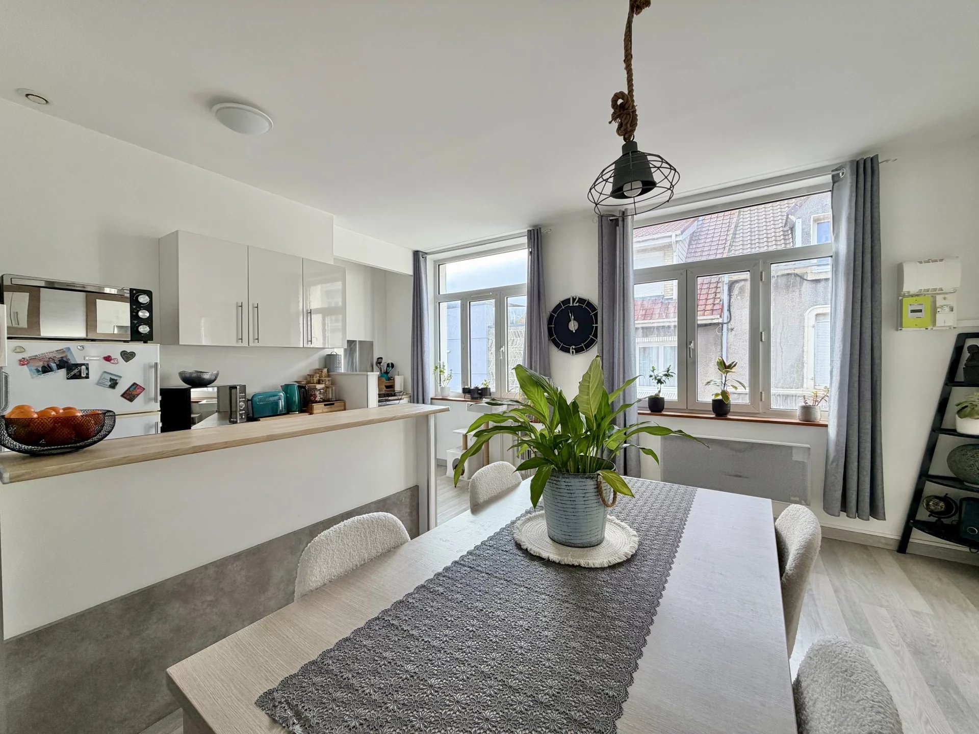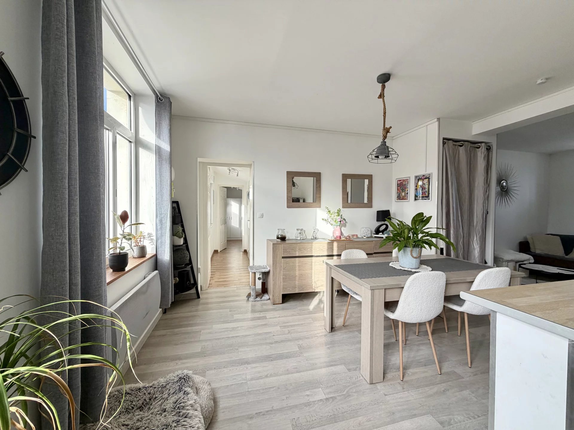 La pièce de vie, conviviale et lumineuse, s'ouvre sur une cuisine aménagée et équipée, pour partager de beau moments.