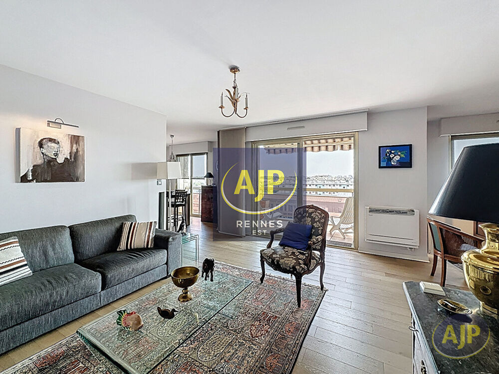 OBERTHUR Appartement de 98.75 m2 avec une vue exceptionnelle sur Rennes. Il se compose d''une belle entrée, d'une pièce de vie exposée SUD s'ouvrant sur un balcon, un espace bureau pouvant être transformé en chambre, une salle à manger avec cuisine semi-ouverte aménagée et équipée. Deux chambres, un dressing, un placard de rangement, une salle d'eau, WC et espace buanderie. Une cave, un box fermé et une place de stationnement complètent ce bien. (5.85 % honoraires TTC à la charge de l'acquéreur.) Copropriété de 74 lots - dont 19 lots habitation. Charges annuelles : 1854 euros.Etat général : Bon Etat