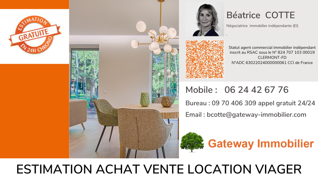 À VENDRE Appartement T3 de 64 m2 avec balcon Cournon-d'Auvergne (63800). Situé dans une copropriété calme et recherchée, cet appartement lumineux de 64 m2 avec balcon offre une belle qualité de vie, proche des commodités et transports. La distribution intérieure propose une pièce de vie agréable ouvrant sur un balcon, deux chambres, une salle d'eau, une cuisine indépendante ouvrant sur le balcon, pour plus de confort, le bien dispose également d'un garage une cave. Chauffage électrique individuel. Un appartement fonctionnel, idéal pour une résidence principale ou un investissement pérenne. COPROPRIÉTÉ : La présente annonce immobilière vise un lot principal situé dans une copropriété formant au total 104 lots, ne faisant l'objet d'aucune procédure en cours, et d'un montant de charges annuelles d'environ 1 586 € déclaré par le vendeur. Surface CARREZ : 64 m2 Performance Énergétique : DPE : Classe E, nouvelle version réalisée le 30/07/2023. Montant moyen estimé des dépenses annuelles d'énergie pour un usage standard entre 1 370 € et 1 890 €). Prix de Vente 143 850 € TTC HAI (honoraires d'agence inclus), dont 6 850 € d'honoraires, à la charge de l'acquéreur, soit 5 %. Net vendeur : 137 000 €. Informations Géorisques :Les informations sur les risques auxquels ce bien est exposé sont disponibles sur le site Géorisques : www.georisques.gouv.fr. Seront ainsi consultables à compter du 1er janvier 2025 au plus tard une fiche d'information sur les obligations de débroussaillement une carte des zones assujetties à une obligation de débroussaillement et de maintien en l'état débroussaillé. Mentions Légales. La présente annonce a été rédigée sous la responsabilité éditoriale de Mme Béatrice COTTE, négociatrice immobilière indépendante (EI), inscrite au RSAC 824 707 103 Clermont-Ferrand, titulaire de la carte de collaborateur No ADC 6300 026, pour le compte de la SAS GATEWAY Immobilier, SIRET 537 849 093, CPI 6324 143. Béatrice COTTE Agent commercial immobilier indépendant Port zéro six - Annonce rédigée et publiée par un Agent Mandataire -Détails :