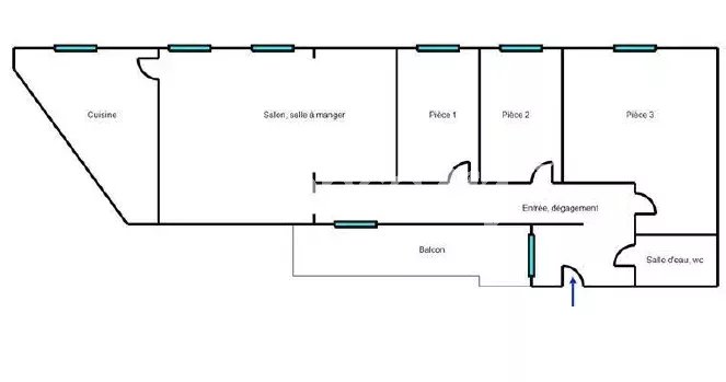 L'appartement se compose d'une entrée, d'un séjour/salle à manger lumineux avec 3 ouvertures sud/ouest, d'un balcon accessible par deux accès différents, de 3 chambres dont une grande avec placards profonds, d'une cuisine indépendante avec fort potentiel d'ouverture sur le séjour, et d'une salle de bain avec WC.