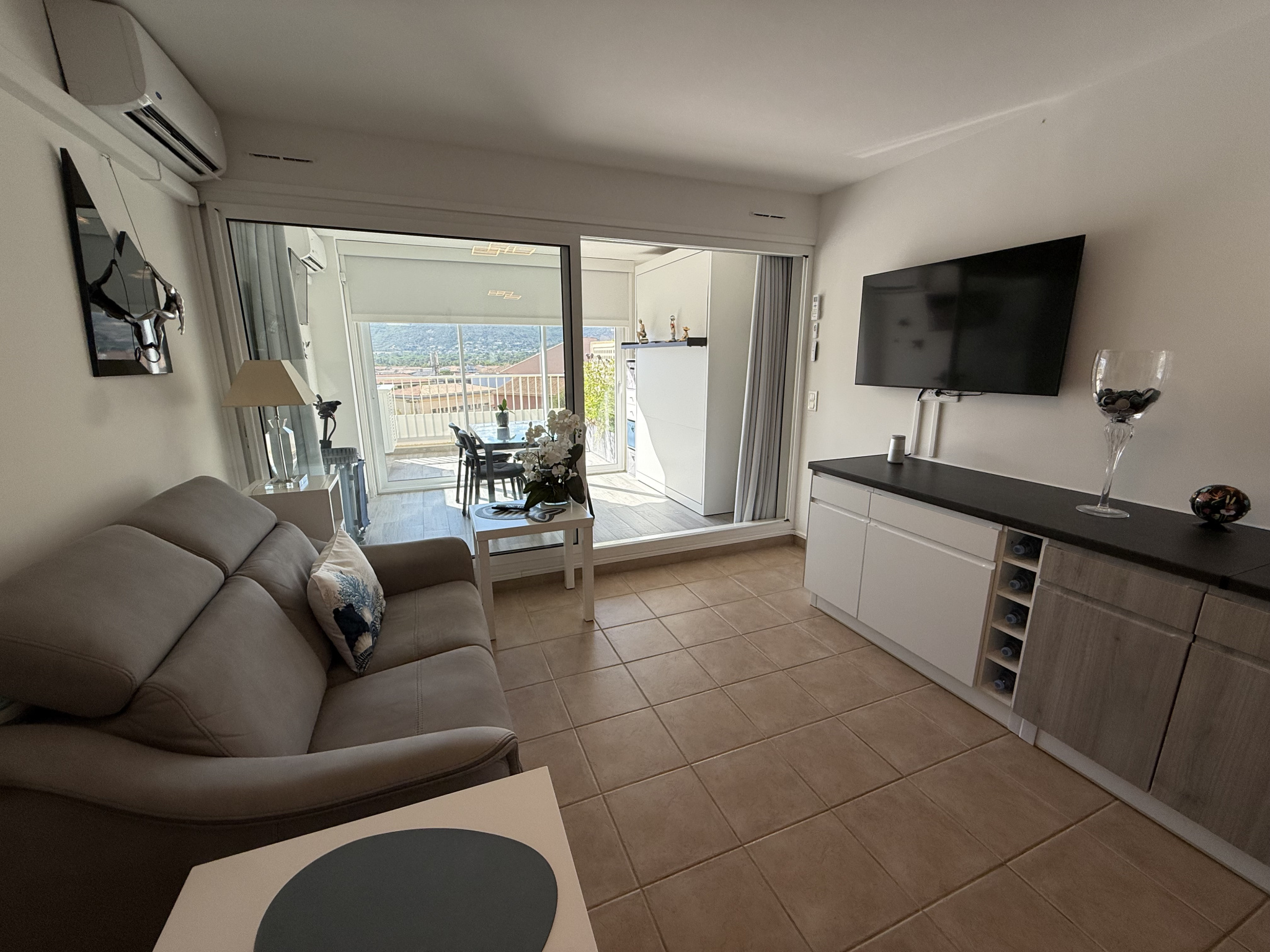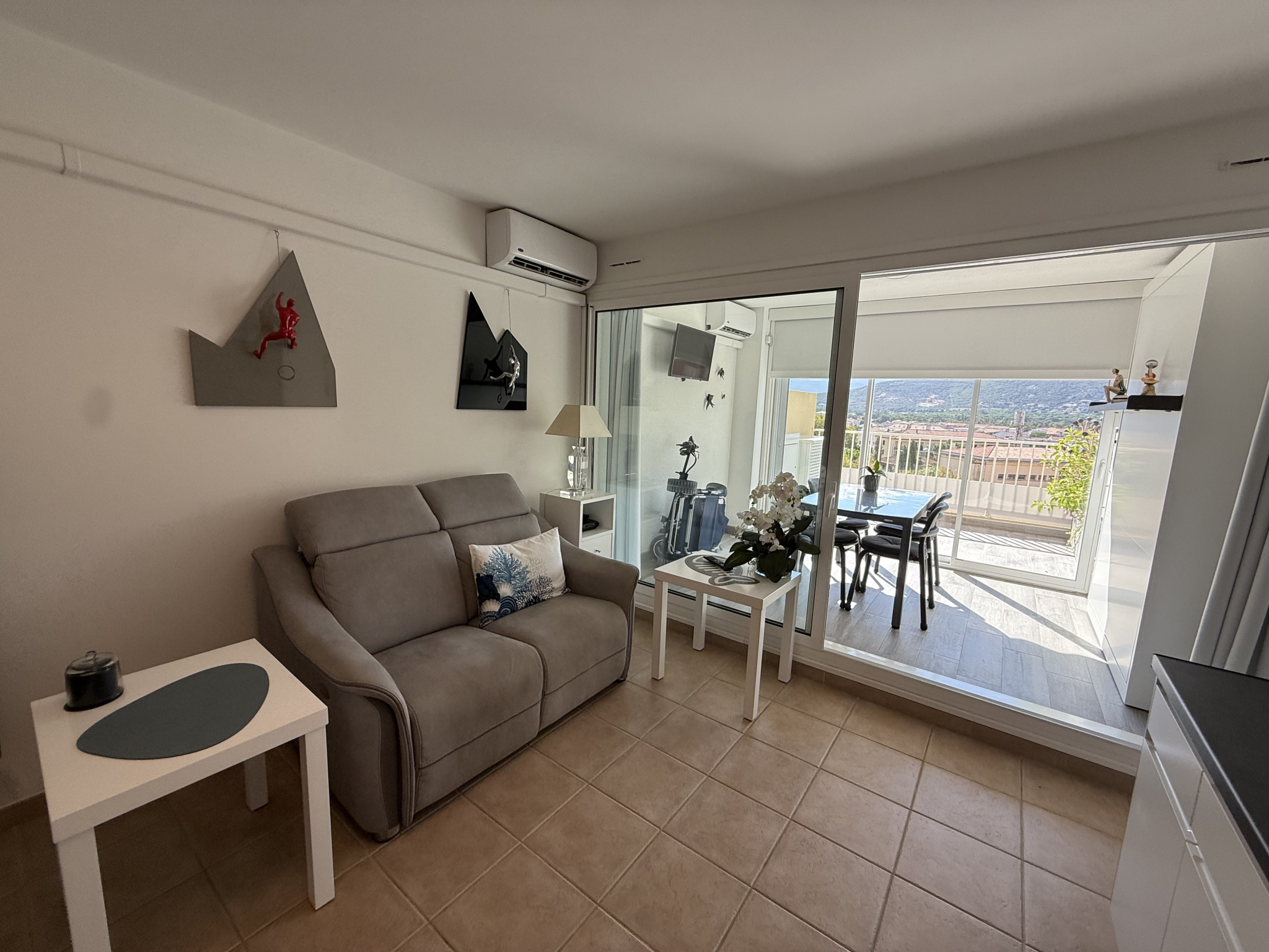 Secteur haut de CALVI - Quartier Les Collines, au calme. A environ 400 m du port et du centre ville. Dans résidence avec parking privé , appartement T2 standing refait entièrement à neuf comprenant entrée, chambre avec double placard (rangement intégré) salle de bains moderne (douche) , wc séparé avec rangement, séjour ouvert sur cuisine équipée, loggia fermée 9 m2 donnant sur terrasse 8 m2 avec store vue montagnes. Décoration moderne et soignée. Disponible de suite. PRIX DE VENTE : 270 000 € incluant 3,85% d'honoraires d'agences TTC à la charge des acquéreurs.Détails :