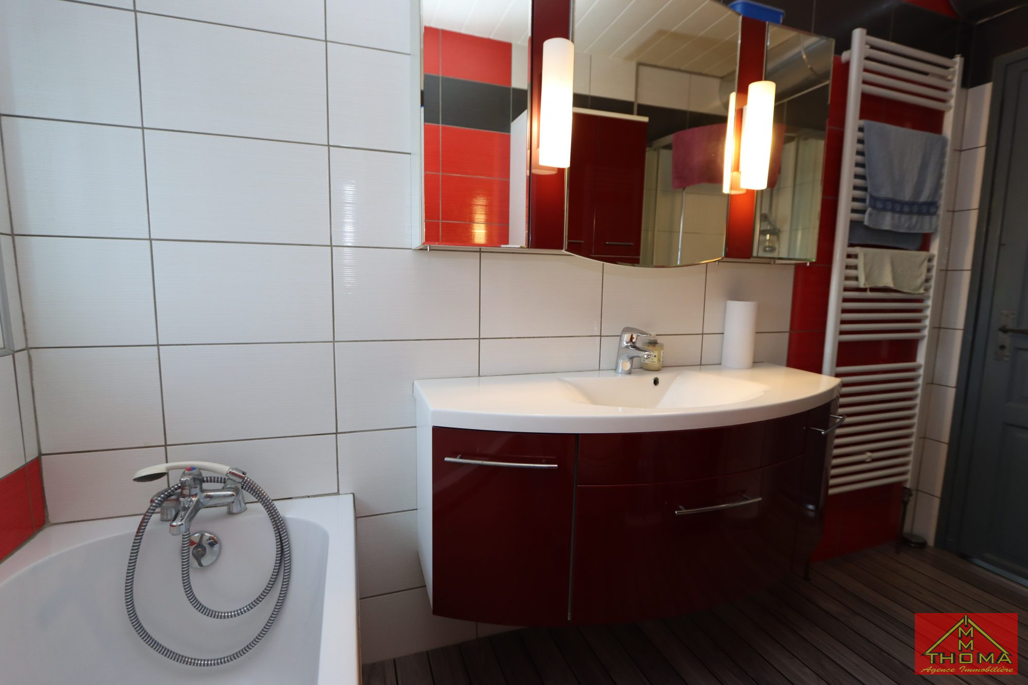 On dispose encore au RDC d'une salle de bain équipée d'une baignoire, d'une douche d'angle, d'un grand meuble avec vasque, d'un sèche-serviettes et d'un WC, le tout dans une atmosphère contemporaine.
