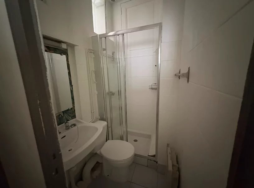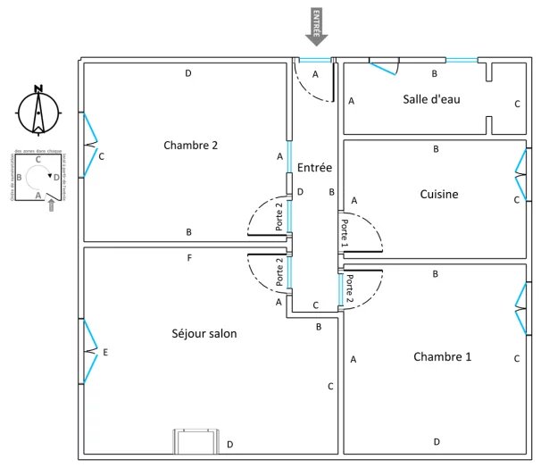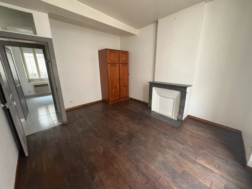 L'appartement se compose d'une entrée desservant une salle d'eau, une cuisine indépendante de 8 m², une première chambre de 12 m² et un séjour-salon de 14 m² avec cheminée, offrant un espace de vie confortable.