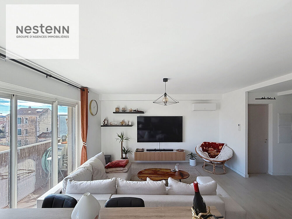 TOULON Découvrez cet appartement baigné de lumière de 86 m². Situé au 2ème étage sur 5 de cette résidence du quartier St Roch à Toulon. Ce bien, entièrement rénové et en excellent état, vous offre un espace de vie agréable avec un séjour spacieux de 34.77 m² exposé plein sud, idéal pour profiter de la lumière naturelle. Vous apprécierez la cuisine américaine aménagée et équipée, parfaite pour vos moments de convivialité. Avec ses 3 chambres confortables et 2 salles d'eau, cet appartement est parfait pour une famille. Vous bénéficierez également d'une climatisation réversible pour un confort optimal toute l'année. La terrasse de 20.08 m² est un véritable atout pour vos soirées d'été. Vous avez la possibilité d'acquérir un garage situé au pied de la résidence en supplémént du prix. Un local à vélos est à disposition. Situé à seulement 2 minutes des écoles et des commerces, et à 10 minutes de la gare, cet appartement bénéficie d'un emplacement idéal. Profitez de la proximité de plusieurs établissements scolaires tels que l'École primaire André Filippi et le Collège Georges Sand, ainsi que de nombreux services à portée de main. Ce bien est une exclusivité de l'agence NESTENN Toulon. Ne manquez pas cette opportunité unique de devenir propriétaire dans un secteur dynamique et en pleine évolution ! Charges annuelles 2828 Euros 30 lots d'habitation. Ce bien est soumis aux statuts de la copropriété. Nestenn immobilier Toulon Email : Site www.immobilier-toulon.nestenn.com Conformément à l'article L.561-5 et suivants du Code Monétaire et Financier, il vous sera demandé de nous présenter une pièce d'identité avant chaque visite. Les informations sur les risques auxquels ce bien est exposé son disponibles sur le site Géorisques. http:/georisques.gouv.frEtat général : Bon Etat