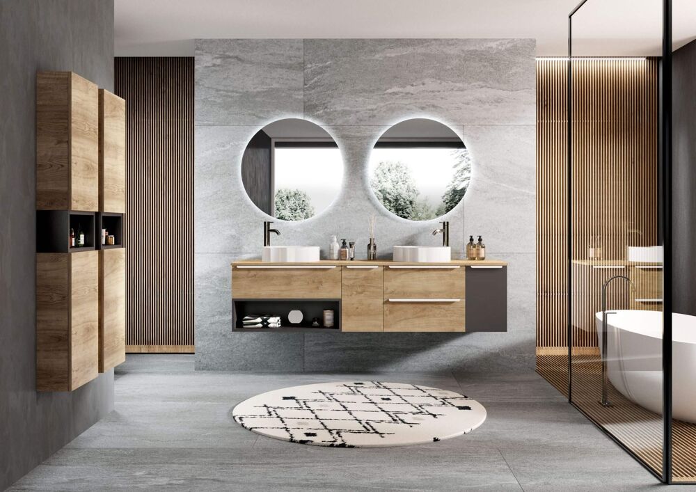Une salle de bain moderne, entièrement équipée, avec double vasque et WC séparé.